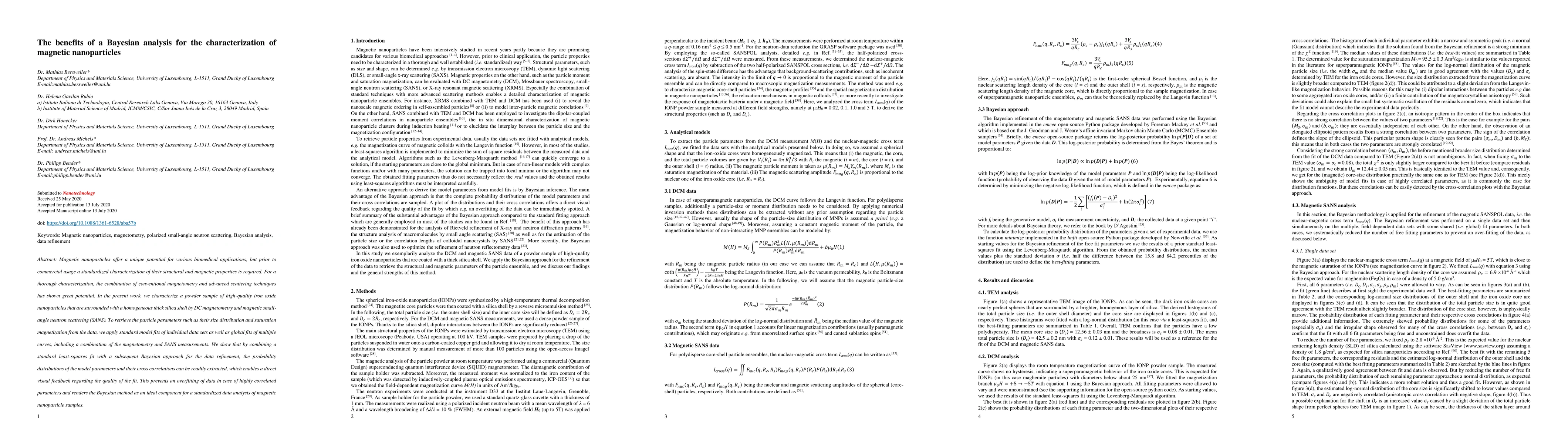 Magnetic nanoparticles offer a unique potential for various biomedical applications, but prior to commercial usage a standardized characterization of their structural and magnetic properties is required. For a thorough characterization, the combination of conventional magnetometry and advanced scattering techniques has shown great potential. In the present work, we characterize a powder sample of high-quality iron oxide nanoparticles that are surrounded with a homogeneous thick silica shell by DC magnetometry and magnetic small-angle neutron scattering (SANS). To retrieve the particle parameters such as their size distribution and saturation magnetization from the data, we apply standard model fits of individual data sets as well as global fits of multiple curves, including a combination of the magnetometry and SANS measurements. We show that by combining a standard least-squares fit with a subsequent Bayesian approach for the data refinement, the probability distributions of the model parameters and their cross correlations can be readily extracted, which enables a direct visual feedback regarding the quality of the fit. This prevents an overfitting of data in case of highly correlated parameters and renders the Bayesian method as an ideal component for a standardized data analysis of magnetic nanoparticle samples.