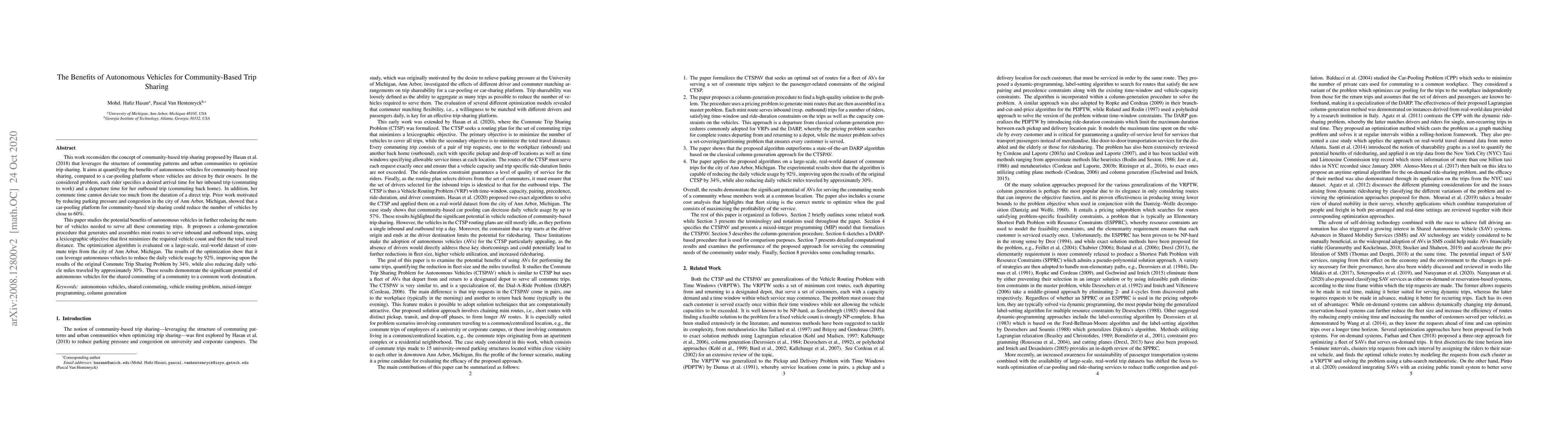 This paper explores the benefits of autonomous vehicles for community-based trip sharing, showing that they can reduce daily vehicle usage by 92% and daily vehicle miles traveled by 30%, outperforming traditional car-pooling platforms. The study uses a column-generation optimization algorithm on real-world commute data from Ann Arbor, Michigan.
