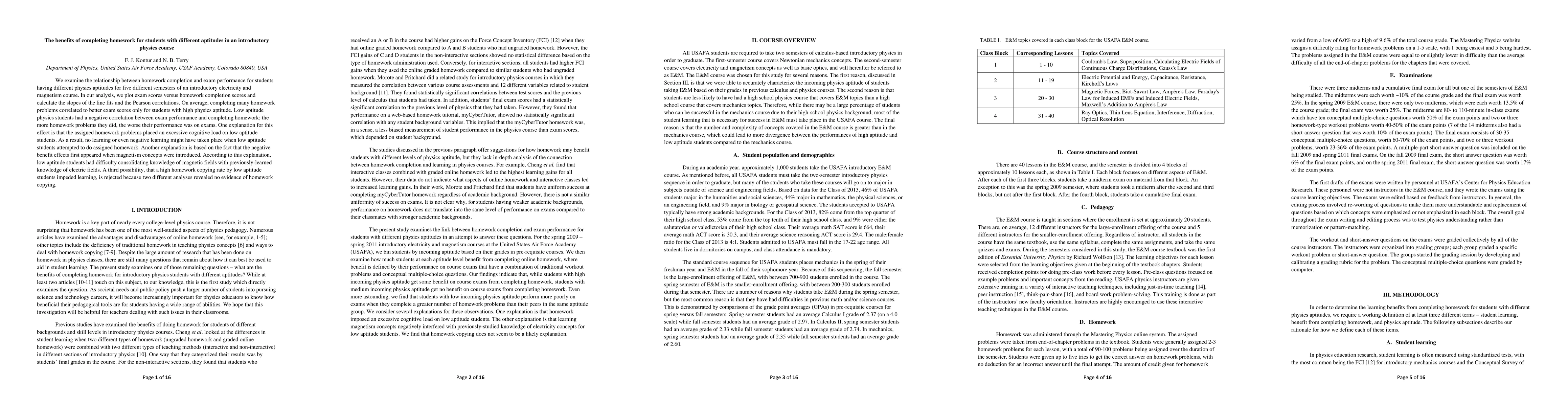 This study finds that homework completion correlates positively with exam performance for high aptitude physics students but negatively for low aptitude students, suggesting that the cognitive load of homework may hinder learning in less capable students, particularly when complex concepts like magnetism are introduced.