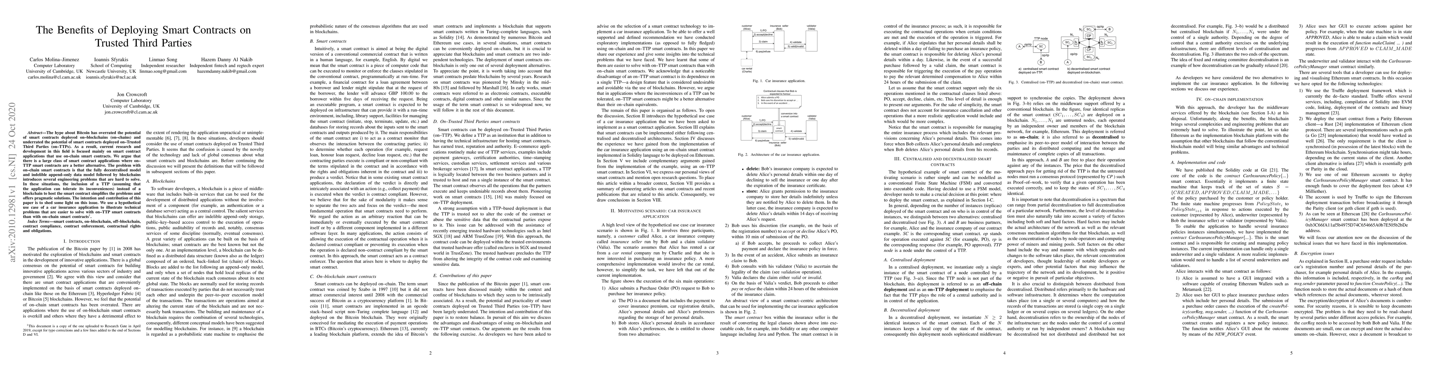 This paper argues that smart contracts deployed on Trusted Third Parties (on-TTPs) offer pragmatic solutions over on-blockchain (on-chain) smart contracts for certain applications, addressing engineering challenges inherent in decentralized blockchain models. The authors illustrate this with a hypothetical car insurance application, highlighting the technical advantages of on-TTP smart contracts.