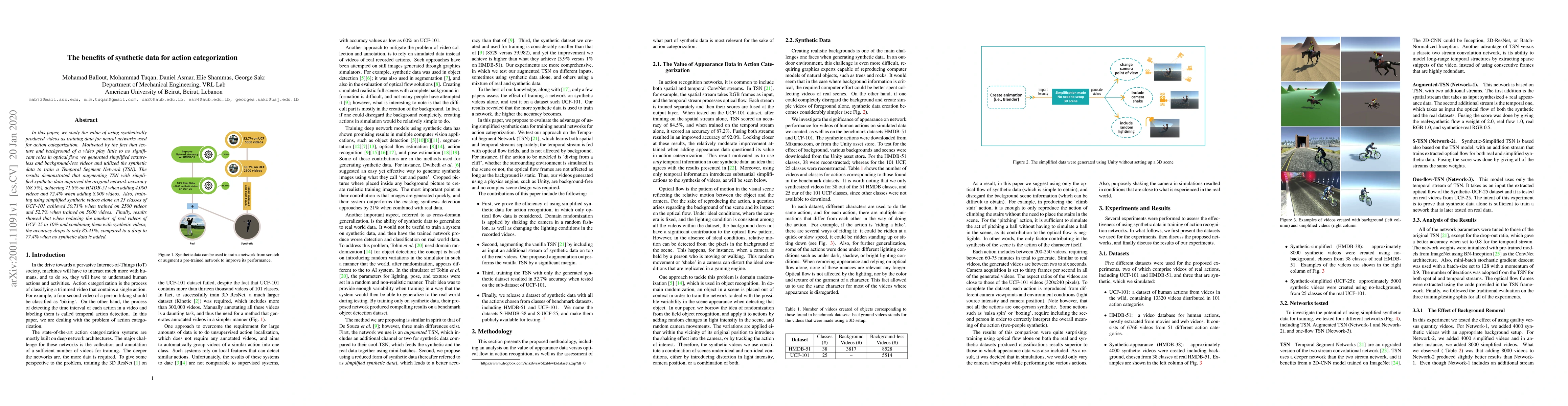 Using synthetic data improves accuracy in action categorization neural networks when training with limited real video data. Adding simplified synthetic videos to the training data can significantly boost performance up to 52.7%.