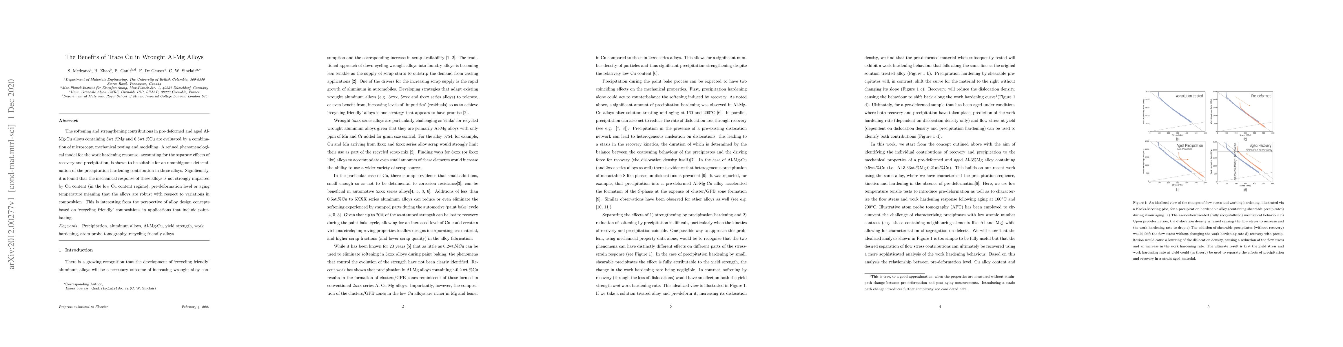 The softening and strengthening contributions in pre-deformed and aged Al-Mg-Cu alloys containing 3wt.%Mg and 0.5wt.%Cu are evaluated by a combination of microscopy, mechanical testing and modelling. A refined phenomenological model for the work hardening response, accounting for the separate effects of recovery and precipitation, is shown to be suitable for an unambiguous determination of the precipitation hardening contribution in these alloys. Significantly, it is found that the mechanical response of these alloys is not strongly impacted by Cu content (in the low Cu content regime), pre-deformation level or aging temperature meaning that the alloys are robust with respect to variations in composition. This is interesting from the perspective of alloy design concepts based on `recycling friendly' compositions in applications that include paint-baking.