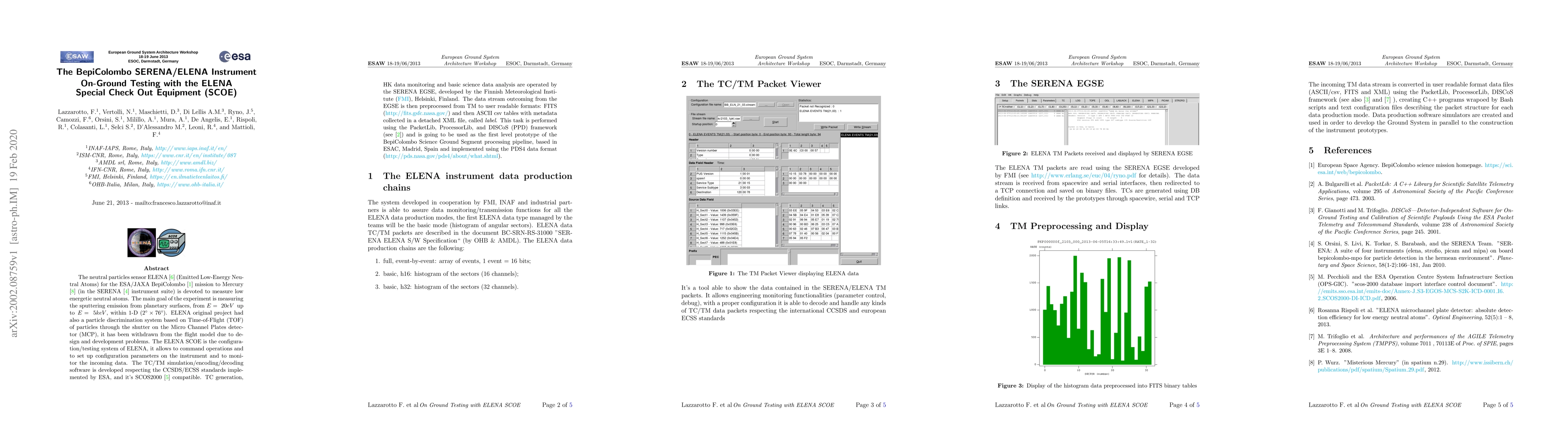 The paper discusses the on-ground testing of the ELENA neutral particles sensor for the BepiColombo mission, focusing on the ELENA Special Check Out Equipment (SCOE). It details the sensor's design to measure low-energy neutral atoms and its intended use for analyzing sputtering emissions from planetary surfaces, while noting the removal of a particle discrimination system due to development issues.