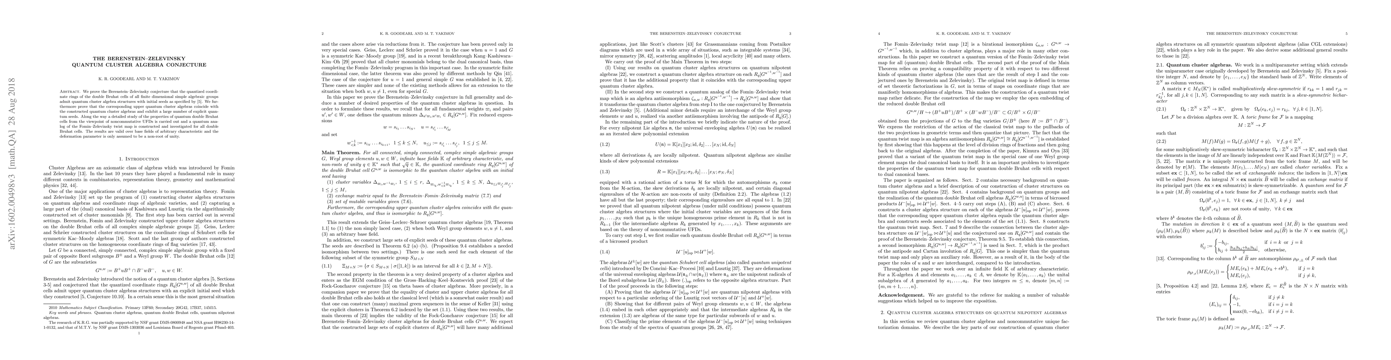 The paper proves the Berenstein-Zelevinsky conjecture regarding the quantum cluster algebra structures of quantized coordinate rings of double Bruhat cells in finite dimensional simple algebraic groups. It also demonstrates the equivalence of the upper quantum cluster algebras and provides explicit quantum seeds, alongside a detailed study of quantum double Bruhat cells and a quantum analog of the Fomin-Zelevinsky twist map.