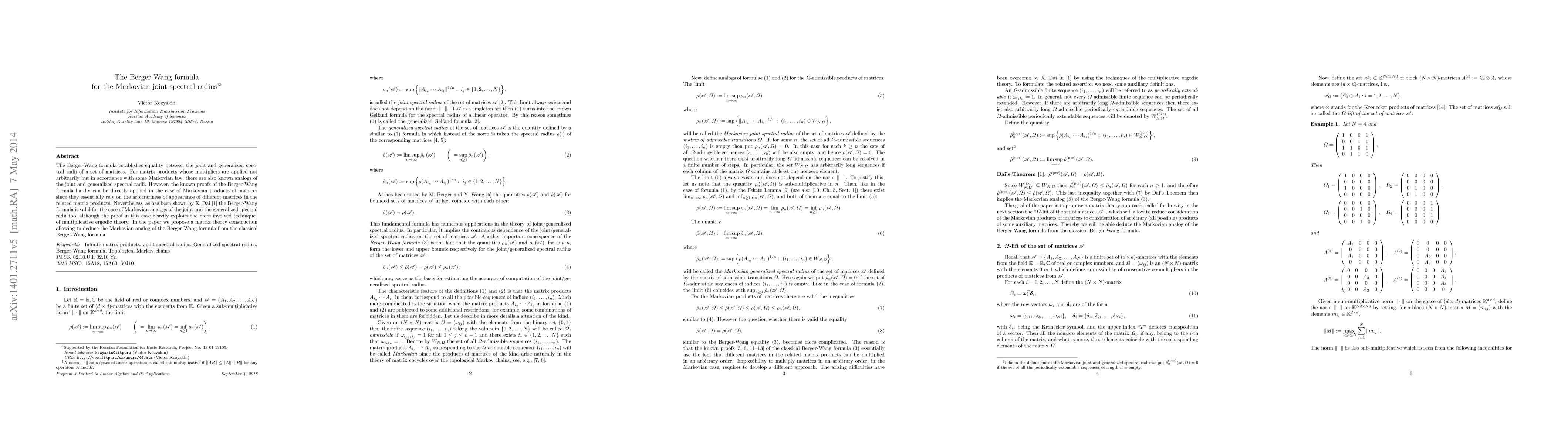 The Berger-Wang formula equates the joint and generalized spectral radii of matrix sets, but its application to Markovian matrix products has been limited. The paper proposes a matrix theory construction to extend the Berger-Wang formula to Markovian products, leveraging advanced techniques from multiplicative ergodic theory.