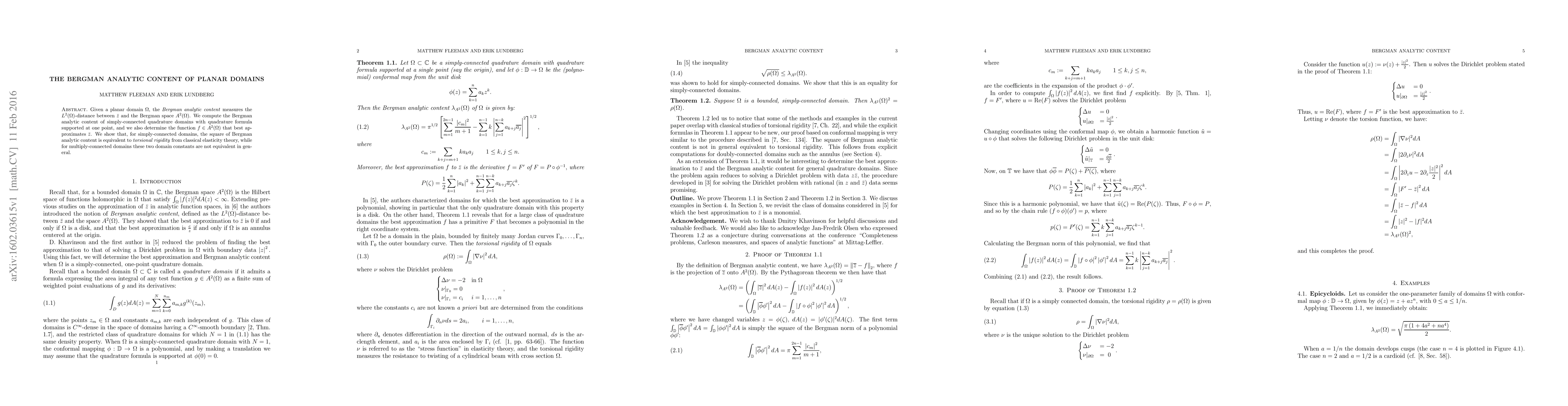This paper computes the Bergman analytic content for simply-connected quadrature domains and determines the best $A^2(\Omega)$ function approximating $\bar{z}$. It finds that the square of Bergman analytic content correlates with torsional rigidity in elasticity for simply-connected domains but not for multiply-connected domains.
