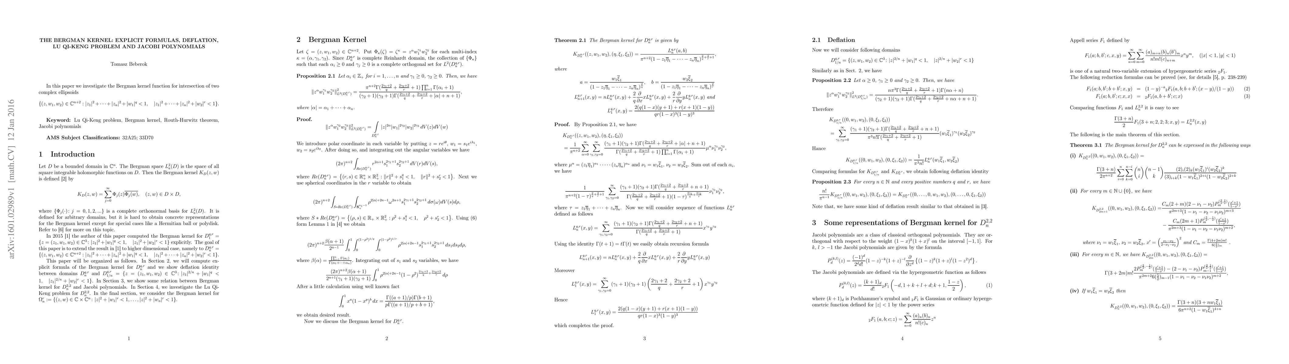 This paper explores explicit formulas for the Bergman kernel function in the intersection of two complex ellipsoids, addressing deflation techniques, Lu Qi-Keng's problem, and connections to Jacobi polynomials.