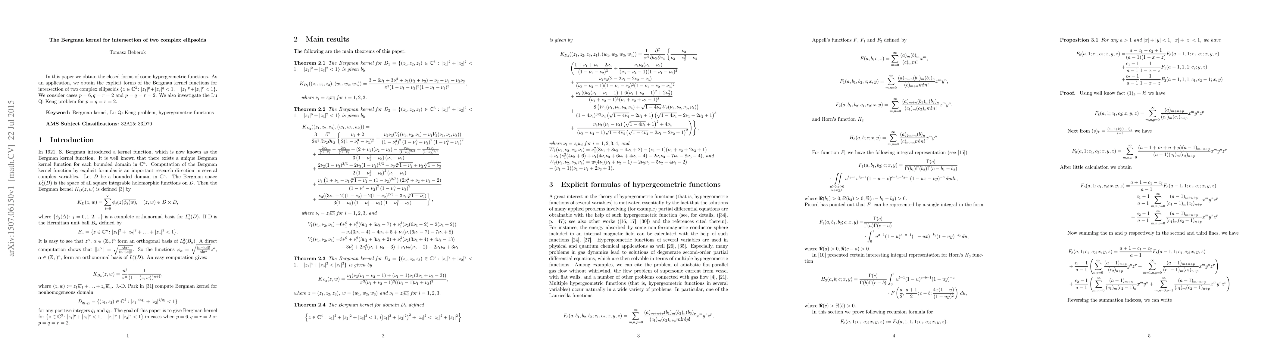 The paper derives closed forms of hypergeometric functions and applies them to obtain explicit forms of Bergman kernel functions for intersections of two complex ellipsoids.