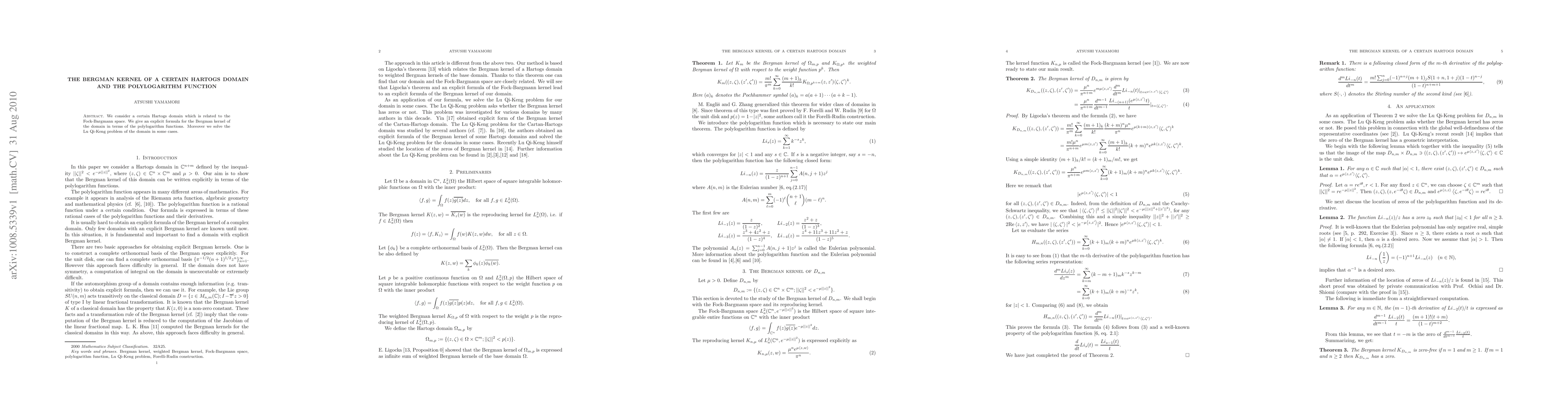 The paper presents an explicit formula for the Bergman kernel of a specific Hartogs domain using polylogarithm functions, and solves the Lu Qi-Keng problem partially for this domain.