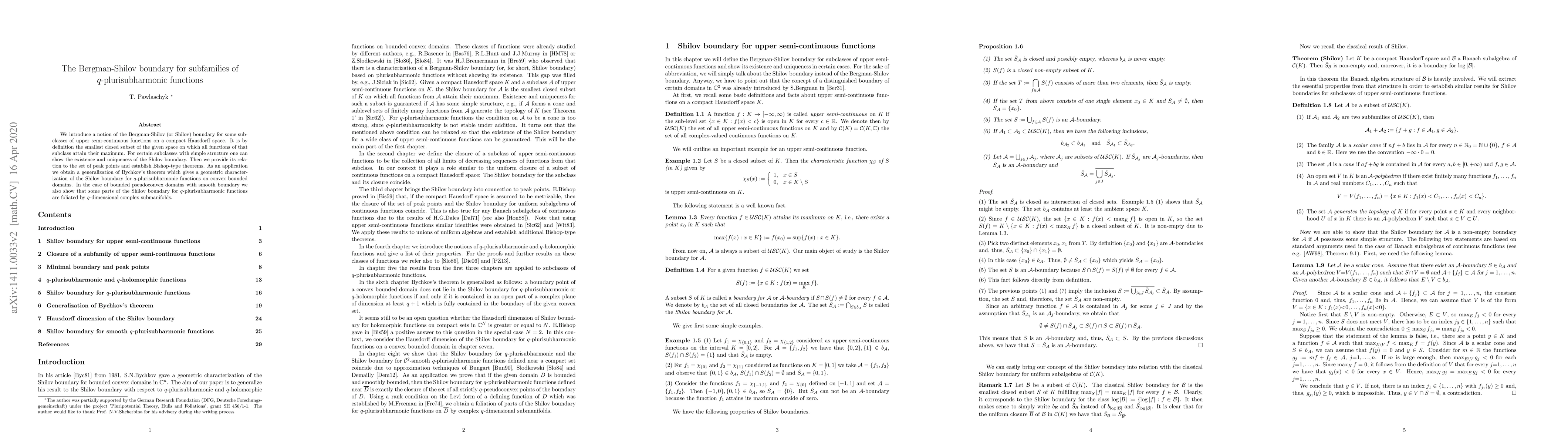 We introduce a notion of the Bergman-Shilov (or Shilov) boundary for some subclasses of upper-semicontinuous functions on a compact Hausdorff space. It is by definition the smallest closed subset of the given space on which all functions of that subclass attain their maximum. For certain subclasses with simple structure one can show the existence and uniqueness of the Shilov boundary. Then we provide its relation to the set of peak points and establish Bishop-type theorems. As an application we obtain a generalization of Bychkov's theorem which gives a geometric characterization of the Shilov boundary for $q$-plurisubharmonic functions on convex bounded domains. In the case of bounded pesudoconvex domains with smooth boundary we also show that some parts of the Shilov boundary for $q$-plurisubharmonic functions are foliated by $q$-dimensional complex submanifolds.
