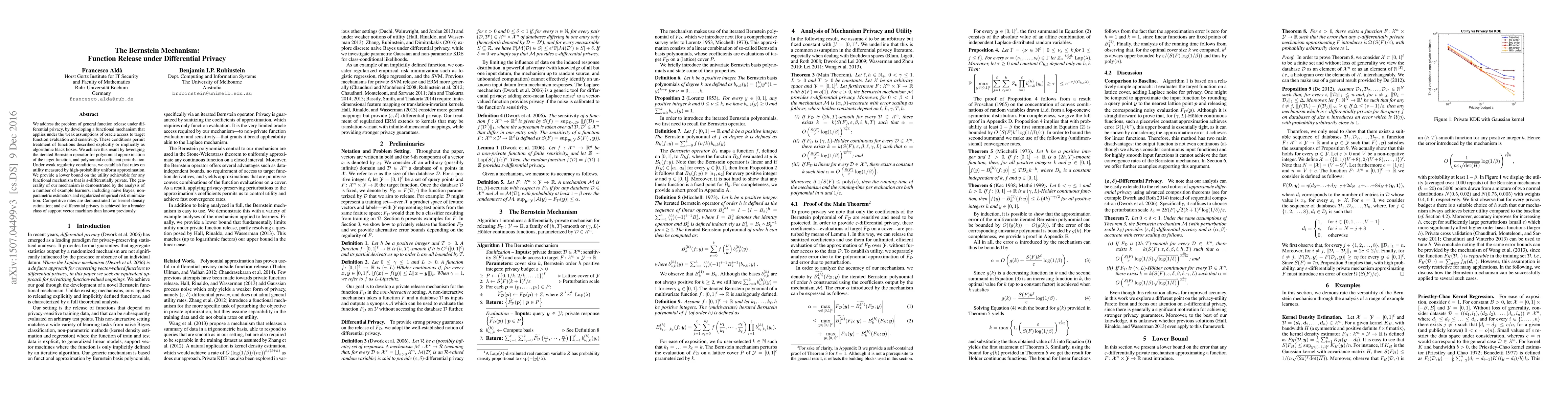 This paper develops a functional mechanism for releasing general functions under differential privacy, using the iterated Bernstein operator for polynomial approximation and coefficient perturbation. It establishes fast utility rates and provides a lower bound on achievable utility for any $\varepsilon$-differentially private functional mechanism.