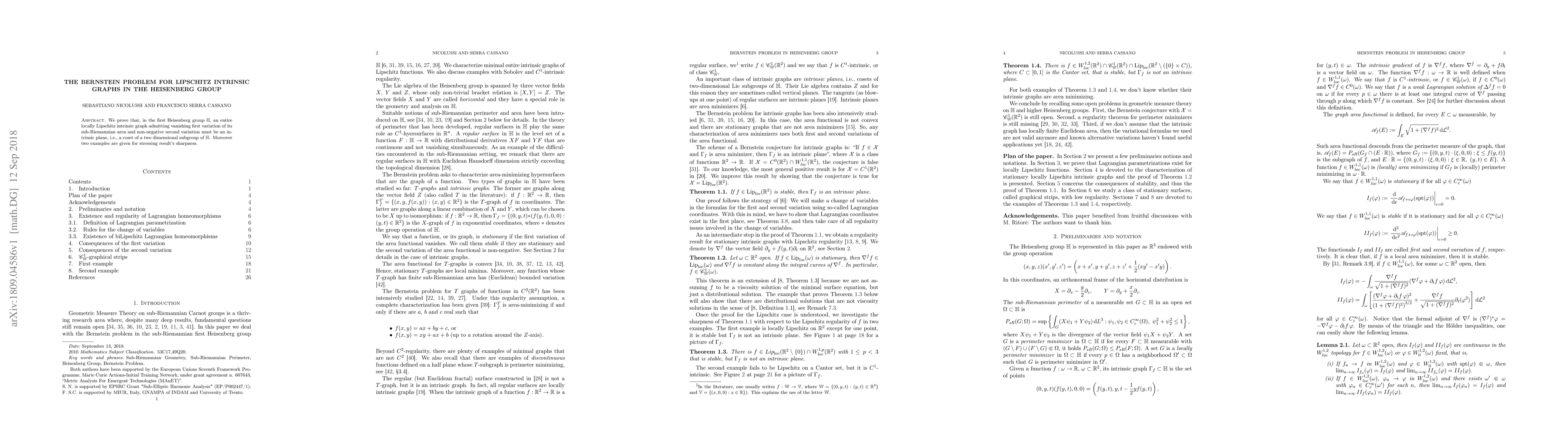 This paper proves that an entire locally Lipschitz intrinsic graph in the first Heisenberg group with vanishing first variation of its sub-Riemannian area and non-negative second variation must be an intrinsic plane. Two examples are provided to illustrate the sharpness of the result.
