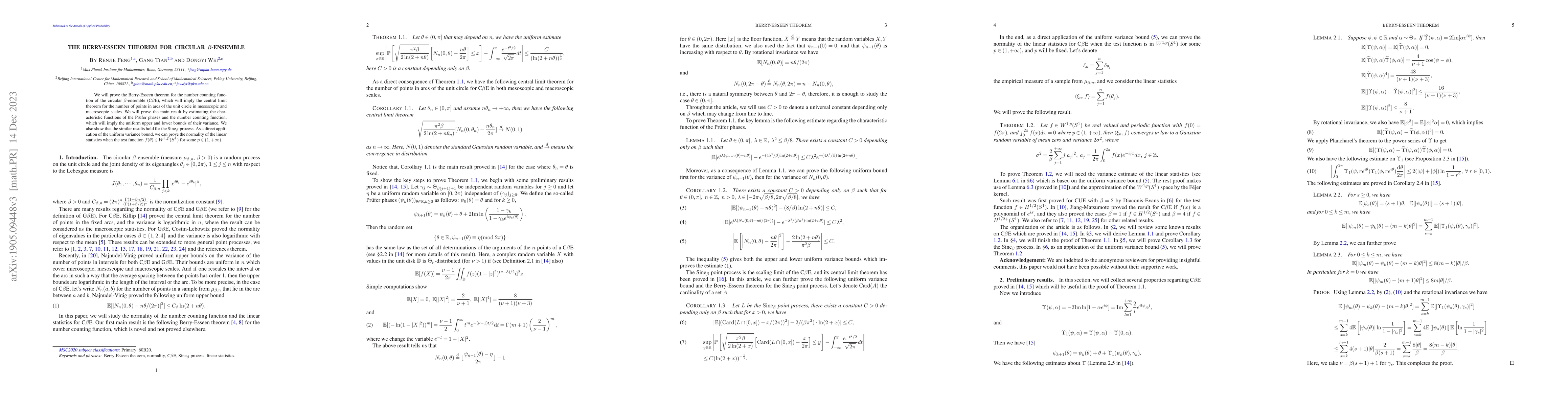 This paper proves the Berry-Esseen theorem for the circular $\beta$-ensemble, establishing central limit theorems for point counts in arcs of the unit circle. It achieves this by estimating characteristic functions and deriving uniform bounds on variances, extending results to the Sine$_\beta$ process and proving normality for linear statistics under certain conditions.