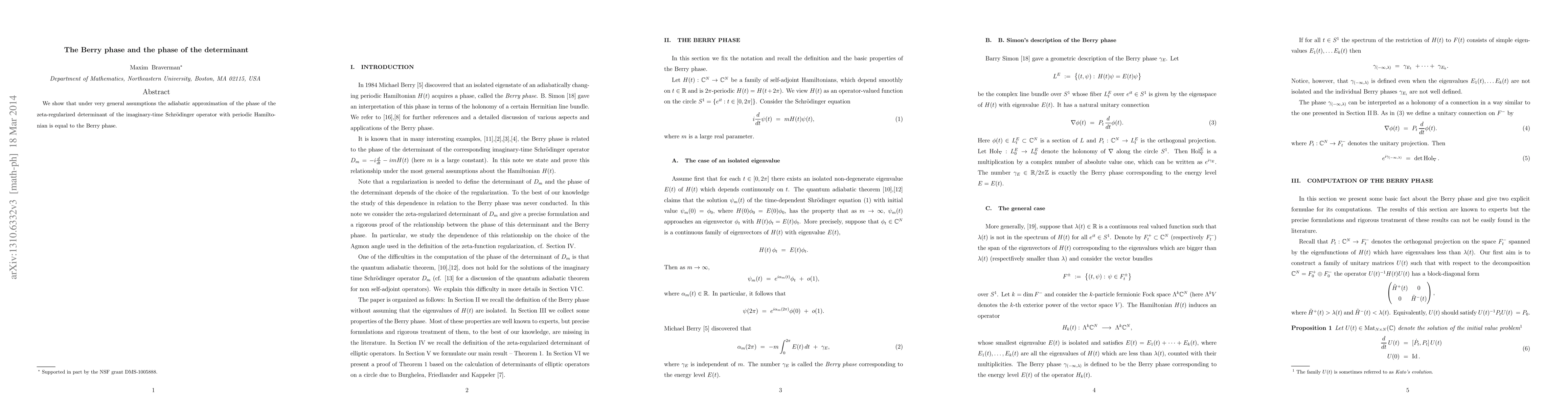 Summary: This paper reveals that the adiabatic phase of the zeta-regularized determinant of an imaginary-time Schrödinger operator with a periodic Hamiltonian equals the Berry phase discovered by Michael Berry in 1984, under general conditions.