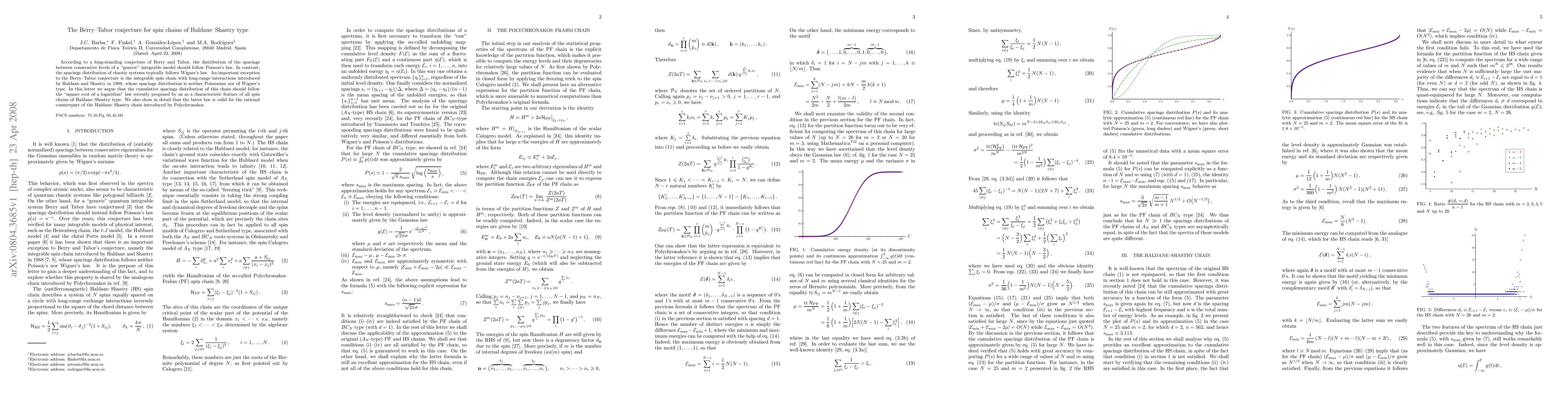 This paper challenges the Berry-Tabor conjecture by demonstrating that integrable spin chains of Haldane-Shastry type exhibit a unique cumulative spacing distribution following a "square root of a logarithm" law, differing from both Poisson and Wigner distributions. The study further confirms this behavior in the rational variant of the Haldane-Shastry chain.