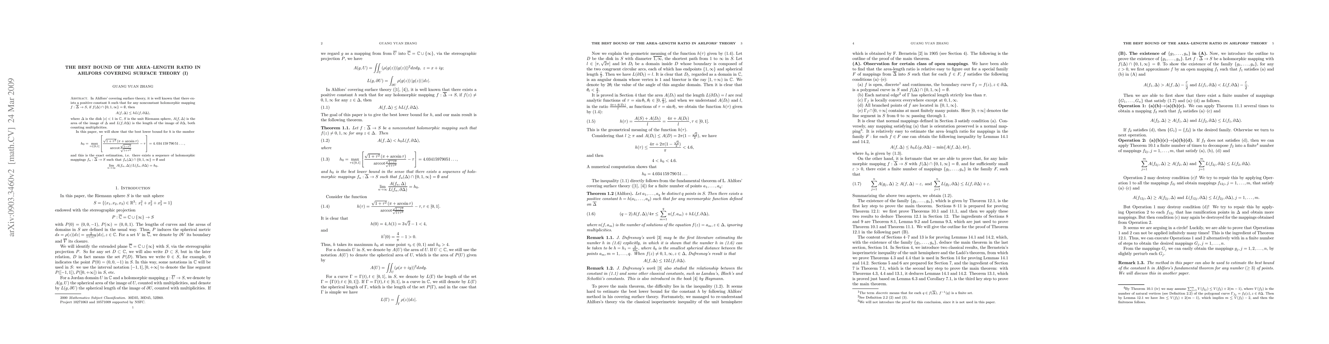 In Ahlfors' covering surface theory, it is well known that there exists a positive constant $h$ such that for any nonconstant holomorphic mapping $f:% \bar{\Delta}\to S,$ if $f(\Delta)\cap \{0,1,\infty \}=\emptyset ,$ then% A(f,\Delta)\leq hL(f,\partial \Delta),% where $\Delta $ is the disk $|z|<1$ in $\mathbb{C},$ $S$ is the unit Riemann sphere, $A(f,\Delta)$ is the area of the image of $\Delta $ and $% L(f,\partial \Delta)$ is the length of the image of $\partial \Delta $, both counting multiplicities. In this paper, we will show that the best lower bound for $h$ is the number h_{0}=\max_{\tau \in \lbrack 0,1]}[ \frac{\sqrt{1+\tau ^{2}}(\pi +\arcsin \tau)}{\mathrm{{arccot}\frac{\sqrt{1-\tau ^{2}}}{\sqrt{% 1+\tau ^{2}}}}}-\tau ] =4. \allowbreak 034 159 790 \allowbreak 51..., % and this is the exact estimation, i.e. there exists a sequence of holomorphic mappings $f_{n}:\bar{\Delta}\to S$ such that $% f_{n}(\Delta)\cap \{0,1,\infty \}=\emptyset $ and \lim_{n\to \infty}A(f_{n},\Delta)/L(f_{n},\partial \Delta)=h_{0}.