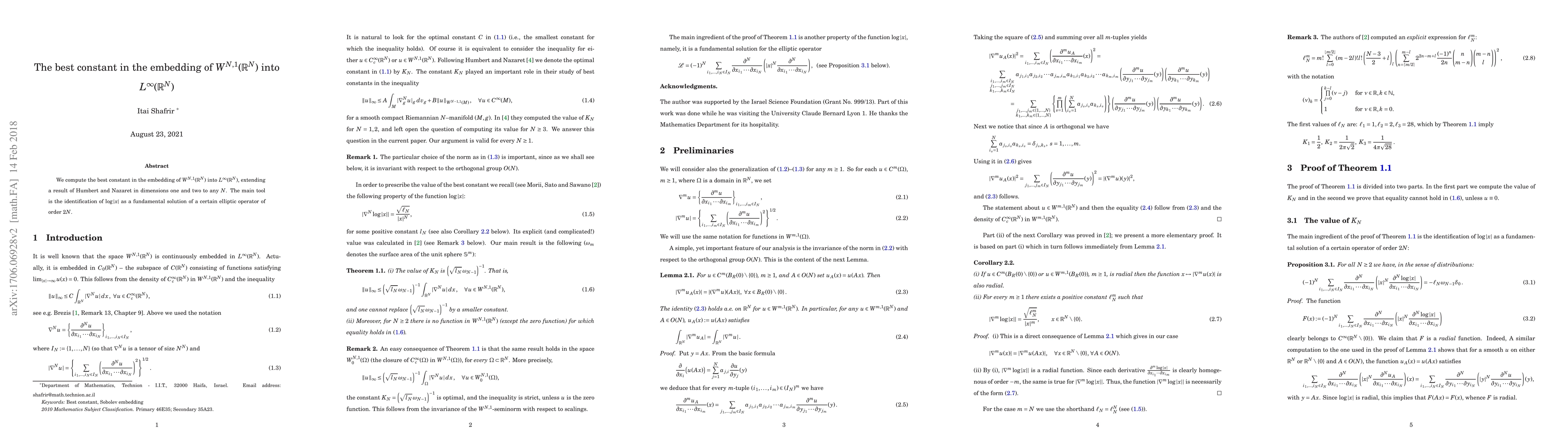 We compute the best constant in the embedding of $W^{N,1}({\mathbb R}^N)$ into $L^\infty({\mathbb R}^N)$, extending a result of Humbert and Nazaret in dimensions one and two to any $N$. The main tool is the identification of $\log |x|$ as a fundamental solution of a certain elliptic operator of order $2N$.