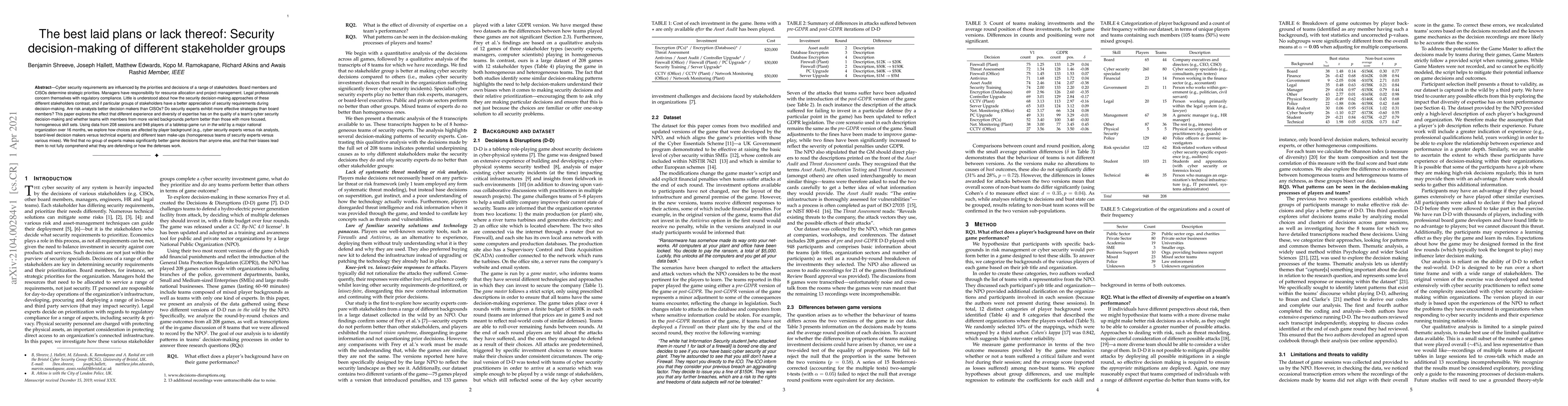 This paper investigates how different stakeholder groups—board members, CISOs, managers, and legal professionals—make cyber security decisions, comparing their effectiveness and expertise diversity. Findings from a 16-month tabletop game involving 208 sessions and 948 participants reveal no significant performance differences among groups, highlighting that biases and lack of comprehensive understanding hinder effective decision-making.