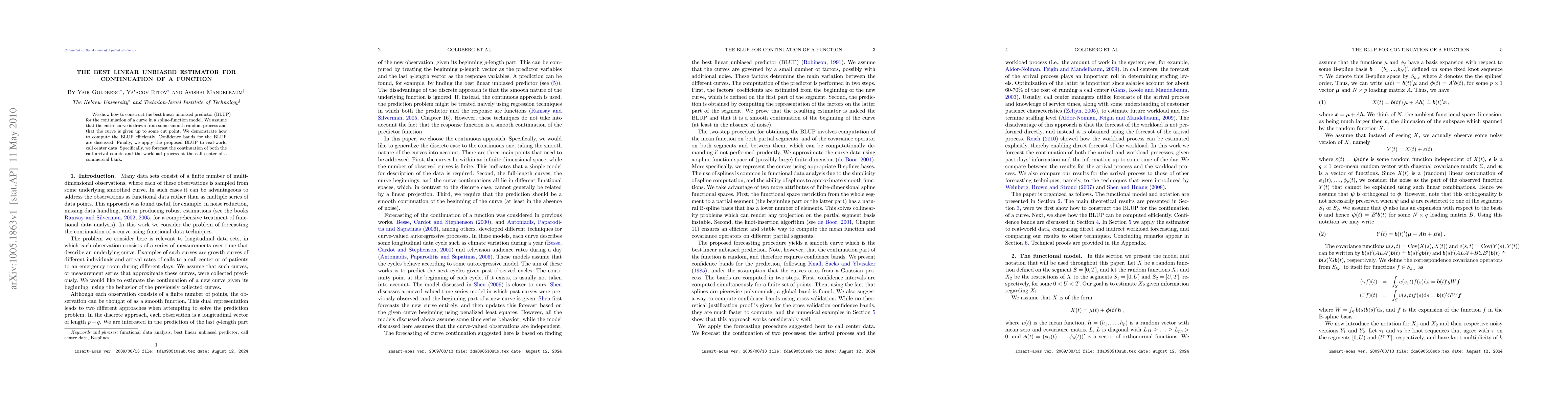 This research presents a method to create the Best Linear Unbiased Predictor (BLUP) for extending a curve in a spline-function model, applicable to real-world data like call center statistics. It details an efficient computation process and discusses confidence bands for BLUP, ultimately applying it to forecast call arrival counts and workload at a commercial bank's call center.
