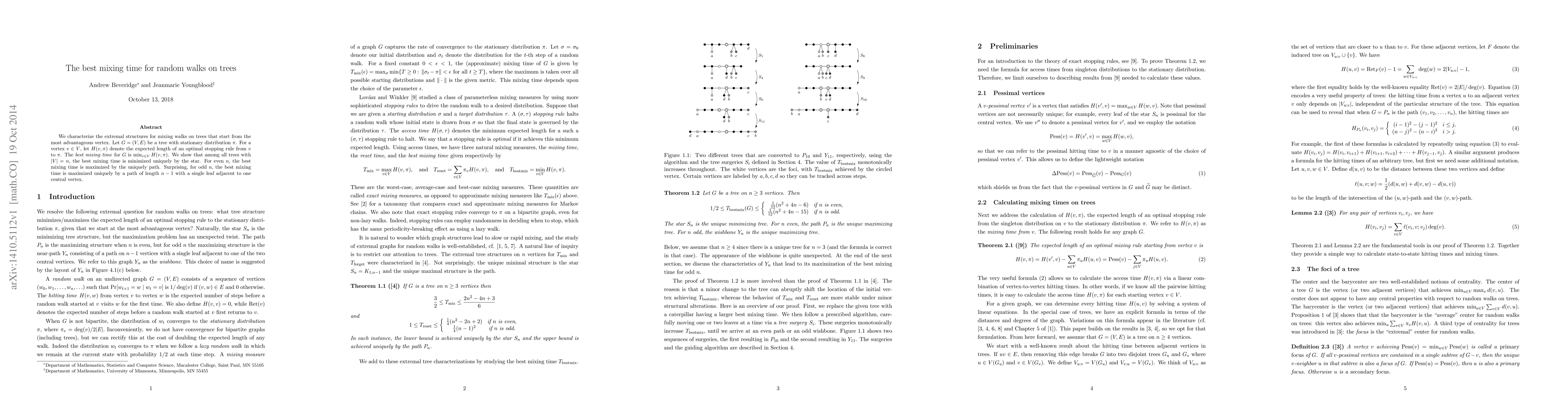 We characterize the extremal structures for mixing walks on trees that start from the most advantageous vertex. Let $G=(V,E)$ be a tree with stationary distribution $\pi$. For a vertex $v \in V$, let $H(v,\pi)$ denote the expected length of an optimal stopping rule from $v$ to $\pi$. The \emph{best mixing time} for $G$ is $\min_{v \in V} H(v,\pi)$. We show that among all trees with $|V|=n$, the best mixing time is minimized uniquely by the star. For even $n$, the best mixing time is maximized by the uniquely path. Surprising, for odd $n$, the best mixing time is maximized uniquely by a path of length $n-1$ with a single leaf adjacent to one central vertex.