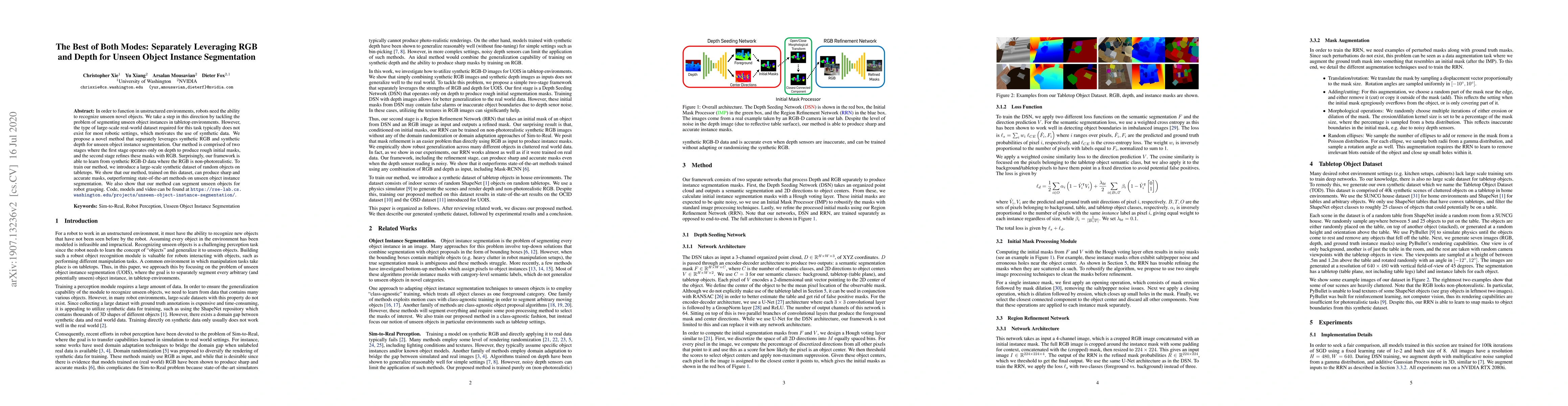 This paper proposes a novel method for segmenting unseen object instances in tabletop environments using synthetic RGB and depth data. The method first uses depth to generate initial masks and then refines them with RGB, achieving superior performance compared to state-of-the-art methods.