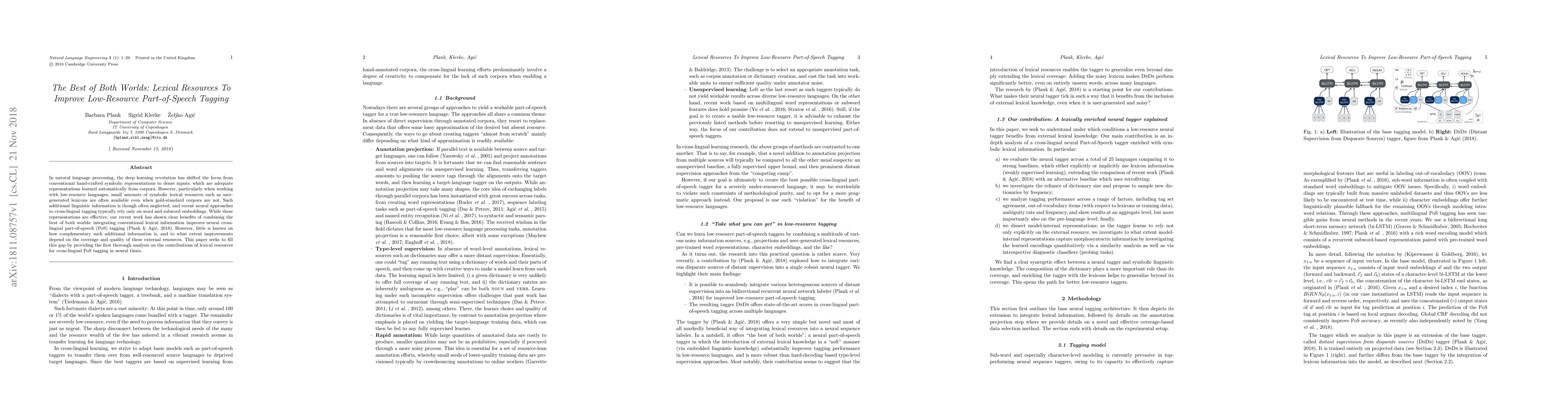 This paper explores the integration of conventional lexical resources with neural models to improve part-of-speech tagging for low-resource languages, demonstrating that combining both dense and symbolic representations yields better performance than relying solely on neural embeddings. It investigates the extent to which the quality and coverage of these lexical resources contribute to the overall tagging accuracy.