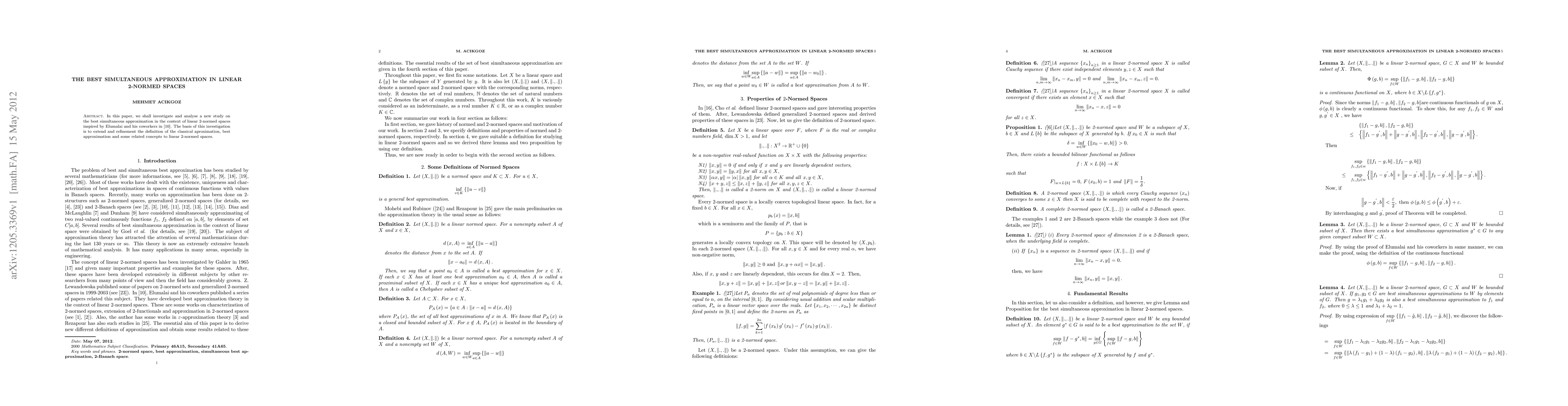 This paper explores the best simultaneous approximation in linear 2-normed spaces, extending classical approximation concepts to this new context, inspired by Elumalai and colleagues. It aims to refine and adapt these definitions to fit the framework of linear 2-normed spaces.