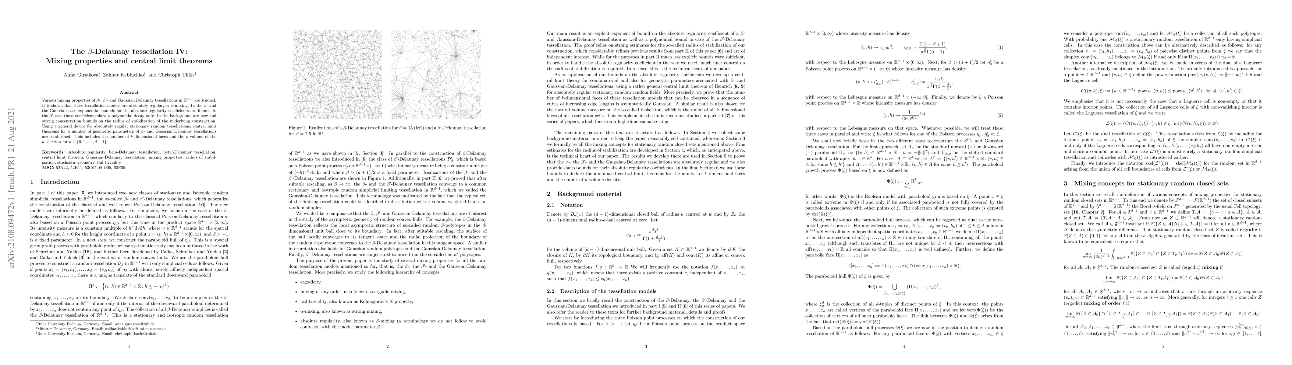 Various mixing properties of $\beta$-, $\beta'$- and Gaussian Delaunay tessellations in $\mathbb{R}^{d-1}$ are studied. It is shown that these tessellation models are absolutely regular, or $\beta$-mixing. In the $\beta$- and the Gaussian case exponential bounds for the absolute regularity coefficients are found. In the $\beta'$-case these coefficients show a polynomial decay only. In the background are new and strong concentration bounds on the radius of stabilization of the underlying construction. Using a general device for absolutely regular stationary random tessellations, central limit theorems for a number of geometric parameters of $\beta$- and Gaussian Delaunay tessellations are established. This includes the number of $k$-dimensional faces and the $k$-volume of the $k$-sk