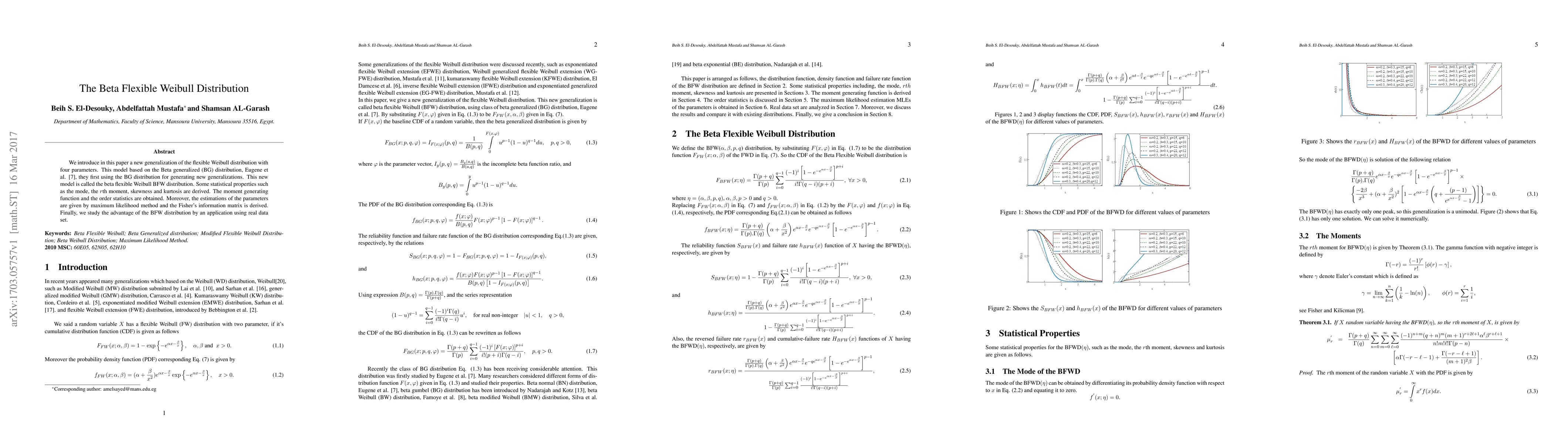 This paper introduces a new four-parameter beta flexible Weibull (BFW) distribution based on the Beta generalized distribution. It derives statistical properties, the moment generating function, and order statistics, and estimates parameters using the maximum likelihood method, demonstrating its utility through real data application.