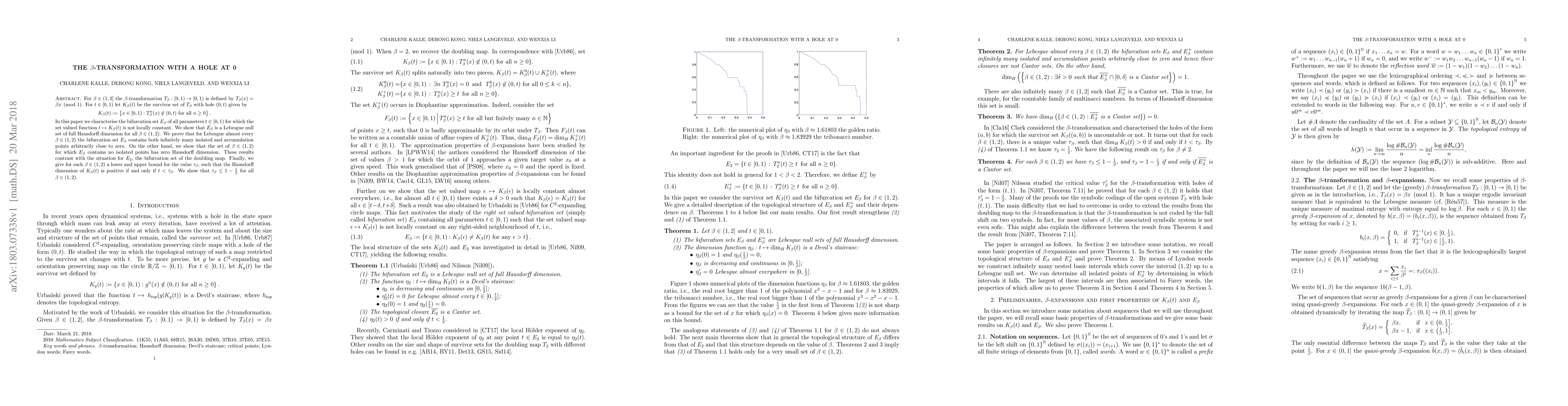 For $\beta\in(1,2]$ the $\beta$-transformation $T_\beta: [0,1) \to [0,1)$ is defined by $T_\beta ( x) = \beta x \pmod 1$. For $t\in[0, 1)$ let $K_\beta(t)$ be the survivor set of $T_\beta$ with hole $(0,t)$ given by \[K_\beta(t):=\{x\in[0, 1): T_\beta^n(x)\not \in (0, t) \textrm{ for all }n\ge 0\}.\] In this paper we characterise the bifurcation set $E_\beta$ of all parameters $t\in[0,1)$ for which the set valued function $t\mapsto K_\beta(t)$ is not locally constant. We show that $E_\beta$ is a Lebesgue null set of full Hausdorff dimension for all $\beta\in(1,2)$. We prove that for Lebesgue almost every $\beta\in(1,2)$ the bifurcation set $E_\beta$ contains both infinitely many isolated and accumulation points arbitrarily close to zero. On the other hand, we show that the set of $\beta\in(1,2)$ for which $E_\beta$ contains no isolated points has zero Hausdorff dimension. These results contrast with the situation for $E_2$, the bifurcation set of the doubling map. Finally, we give for each $\beta \in (1,2)$ a lower and upper bound for the value $\tau_\beta$, such that the Hausdorff dimension of $K_\beta(t)$ is positive if and only if $t< \tau_\beta$. We show that $\tau_\beta \le 1-\frac1{\beta}$ for all $\beta \in (1,2)$.