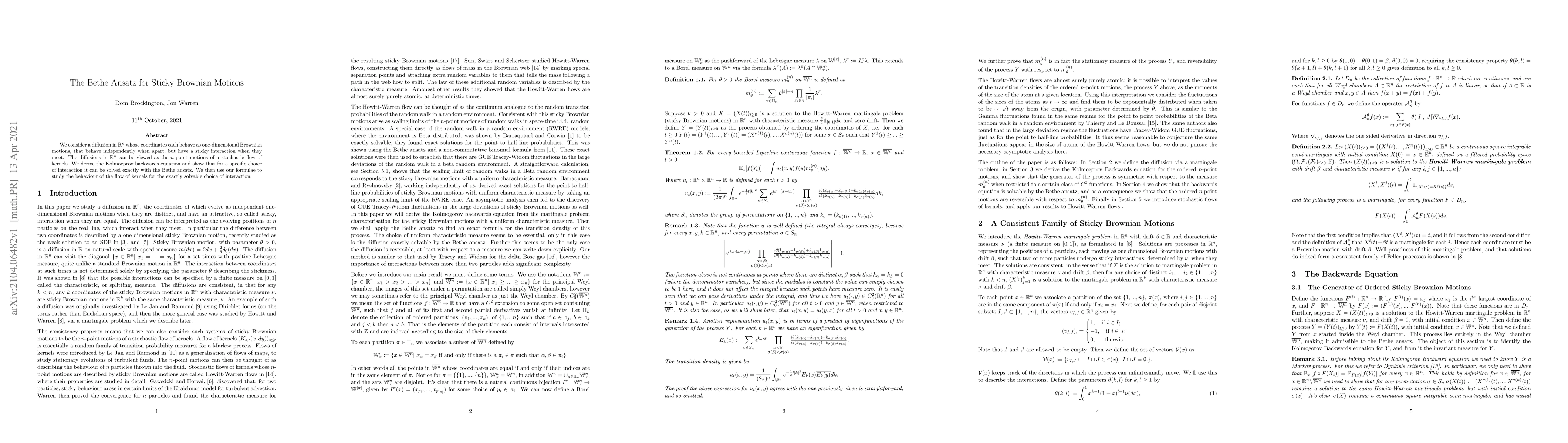 The paper demonstrates the application of the Bethe Ansatz to derive exact solutions for the Kolmogorov backward equation in the context of sticky Brownian motions.