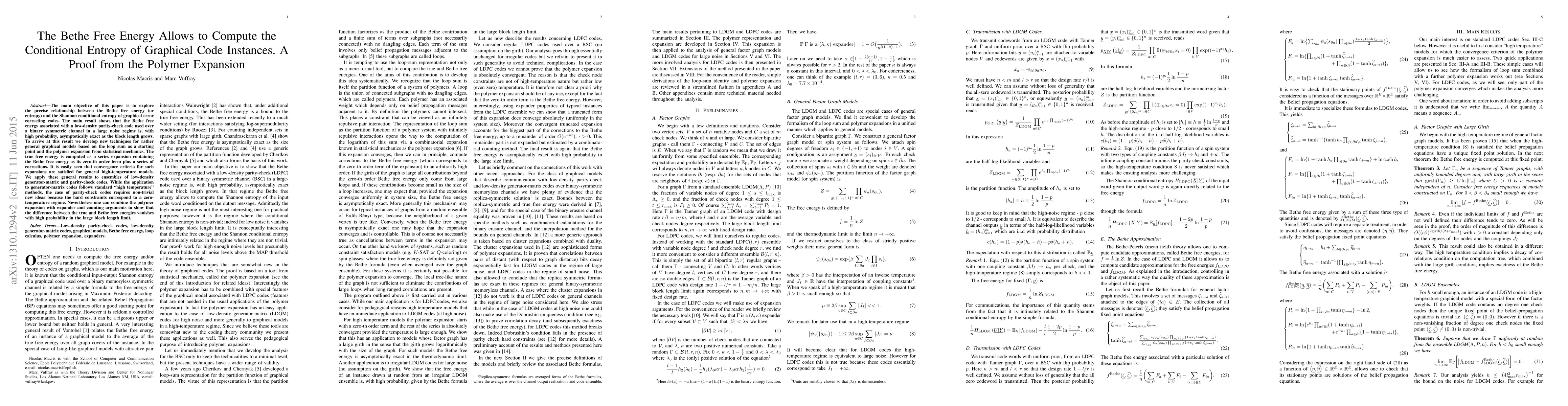 The main objective of this paper is to explore the precise relationship between the Bethe free energy (or entropy) and the Shannon conditional entropy of graphical error correcting codes. The main result shows that the Bethe free energy associated with a low-density parity-check code used over a binary symmetric channel in a large noise regime is, with high probability, asymptotically exact as the block length grows. To arrive at this result we develop new techniques for rather general graphical models based on the loop sum as a starting point and the polymer expansion from statistical mechanics. The true free energy is computed as a series expansion containing the Bethe free energy as its zero-th order term plus a series of corrections. It is easily seen that convergence criteria for such expansions are satisfied for general high-temperature models. We apply these general results to ensembles of low-density generator-matrix and parity-check codes. While the application to generator-matrix codes follows standard "high temperature" methods, the case of parity-check codes requires non-trivial new ideas because the hard constraints correspond to a zero-temperature regime. Nevertheless one can combine the polymer expansion with expander and counting arguments to show that the difference between the true and Bethe free energies vanishes with high probability in the large block