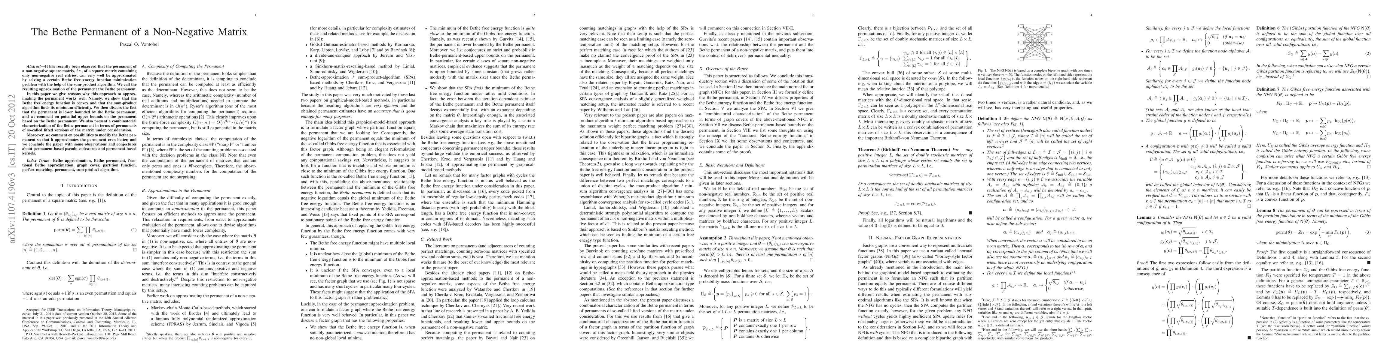 The paper introduces the concept of the Bethe permanent and demonstrates its properties, providing a theoretical foundation for approximating permanents of non-negative matrices.