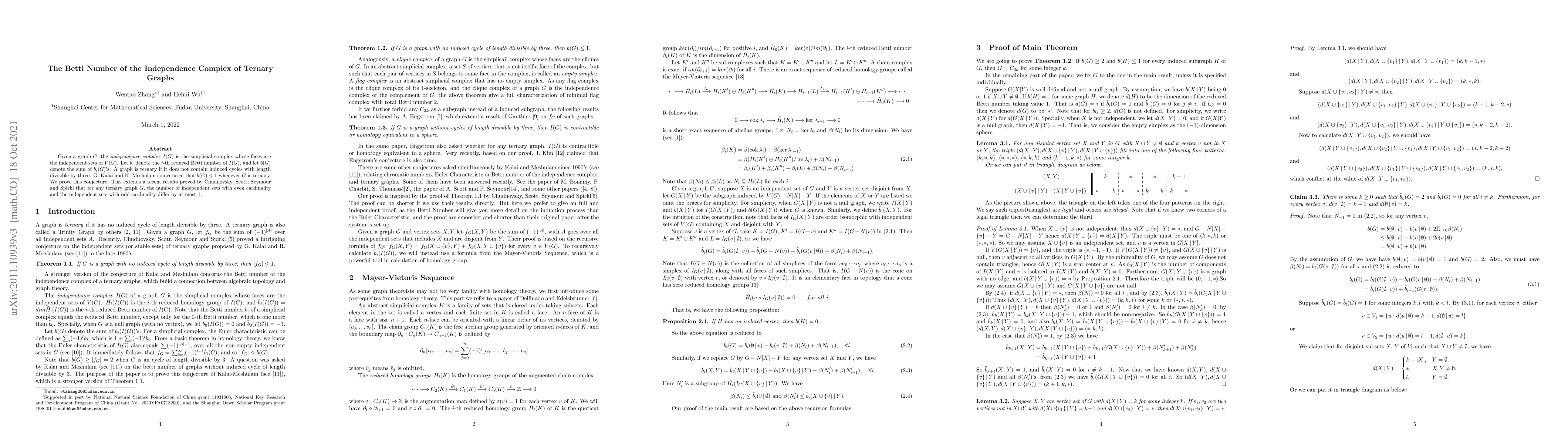 Given a graph $G$, the \textit{independence complex} $I(G)$ is the simplicial complex whose faces are the independent sets of $V(G)$. Let $\tilde{b}_i$ denote the $i$-th reduced Betti number of $I(G)$, and let $b(G)$ denote the sum of $\tilde{b}_i(G)$'s. A graph is ternary if it does not contain induced cycles with length divisible by three. G. Kalai and K. Meshulam conjectured that $b(G)\le 1$ whenever $G$ is ternary. We prove this conjecture. This extends a recent results proved by Chudnovsky, Scott, Seymour and Spirkl that for any ternary graph $G$, the number of independent sets with even cardinality and the independent sets with odd cardinality differ by at most 1.