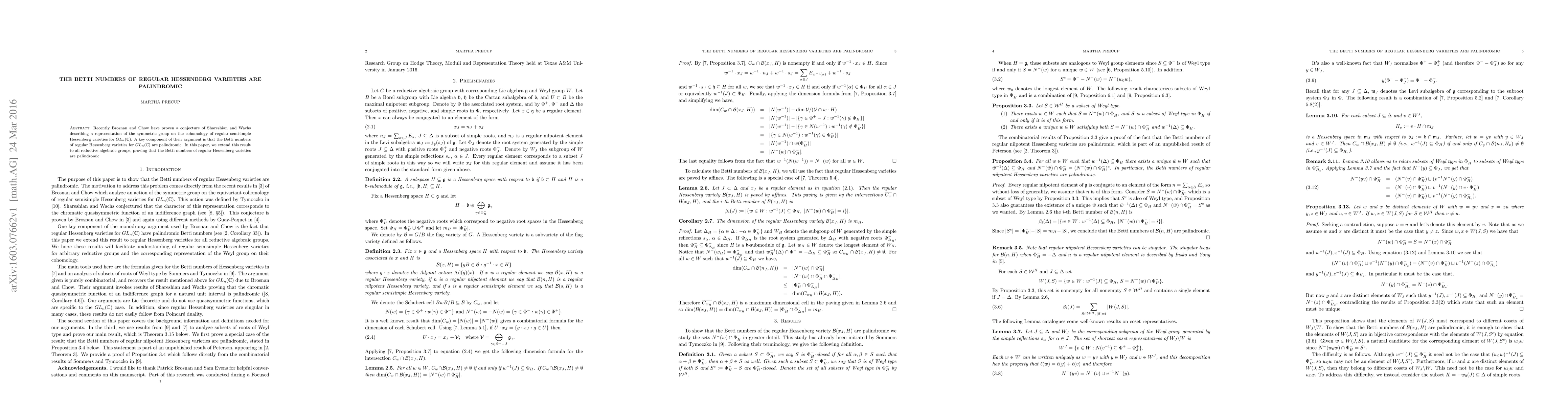 Recently Brosnan and Chow have proven a conjecture of Shareshian and Wachs describing a representation of the symmetric group on the cohomology of regular semisimple Hessenberg varieties for $GL_n(\mathbb{C})$. A key component of their argument is that the Betti numbers of regular Hessenberg varieties for $GL_n(\mathbb{C})$ are palindromic. In this paper, we extend this result to all reductive algebraic groups, proving that the Betti numbers of regular Hessenberg varieties are palindromic.