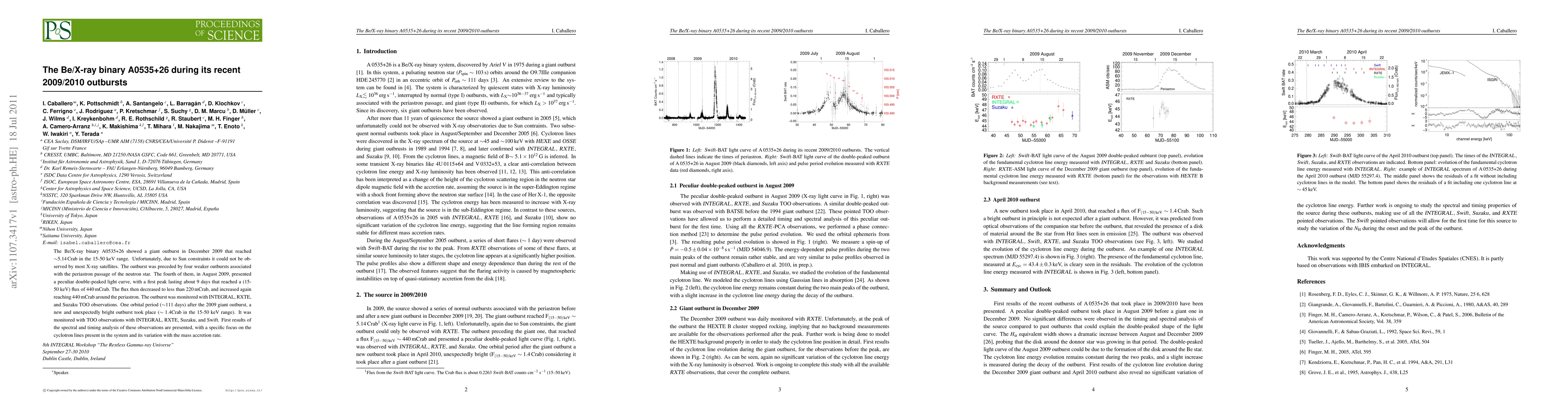 The Be/X-ray binary A0535+26 experienced a giant outburst in 2009, followed by another bright outburst ~111 days later, with observations indicating changing cyclotron lines that correlate with mass accretion rate.
