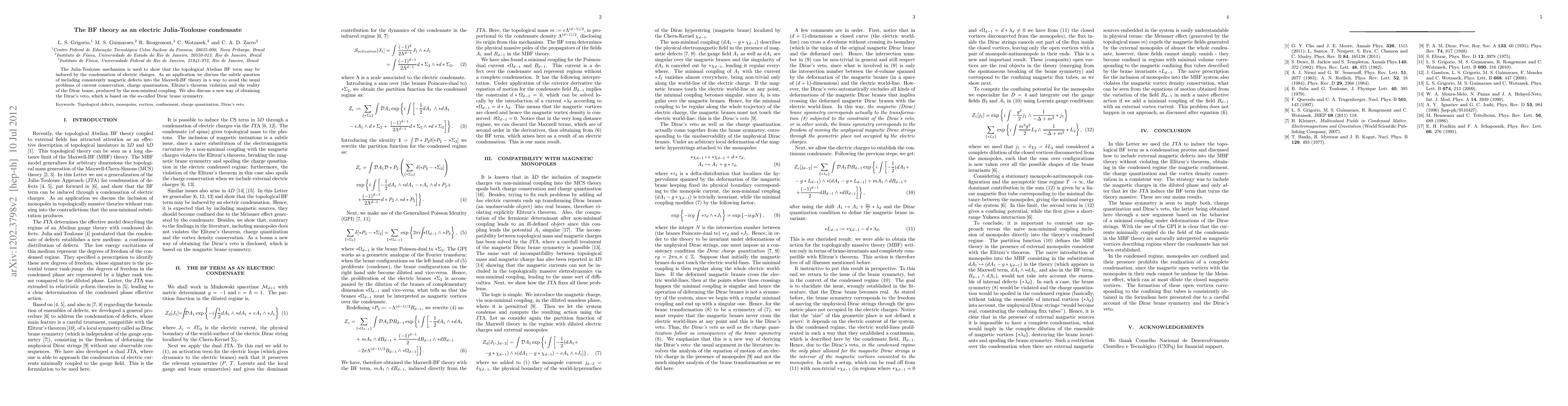 The Julia-Toulouse mechanism is used to show that the topological Abelian BF term may be induced by the condensation of electric charges. As an application we discuss the subtle question of including consistently magnetic defects into the Maxwell-BF theory in a way to avoid the usual problems of current conservation, charge quantization, Elitzur's theorem violation and the reality of the Dirac brane, produced by the non-minimal coupling. We also discuss a new way of obtaining the Dirac's veto, which is based on the so-called Dirac brane symmetry.
