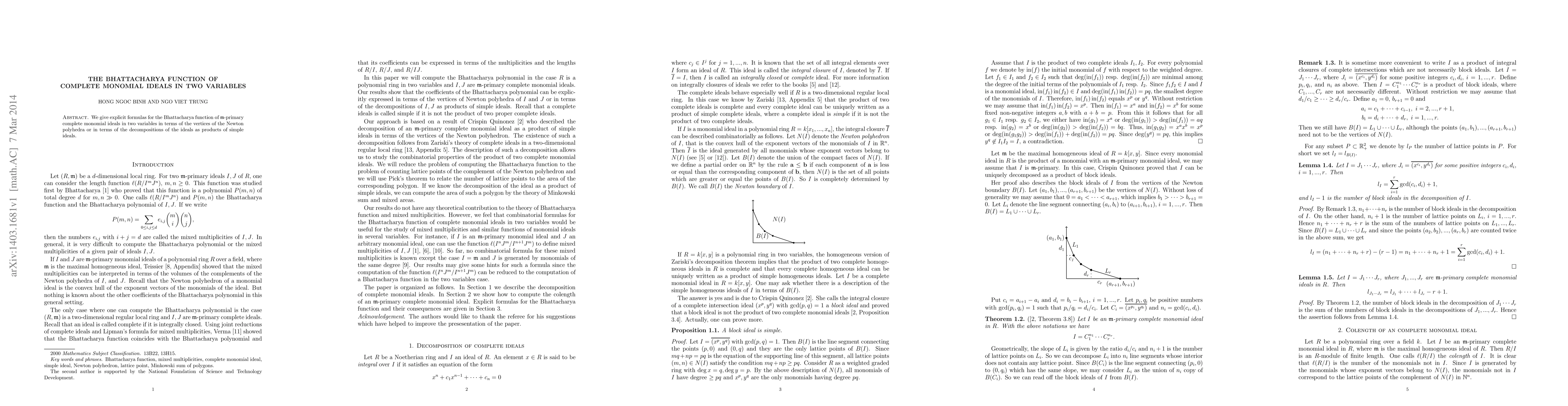 We give explicit formulas for the Bhattacharya function of m-primary complete monomial ideals in two variables in terms of the vertices of the Newton polyhedra or in terms of the decompositions of the ideals as products of simple ideals.