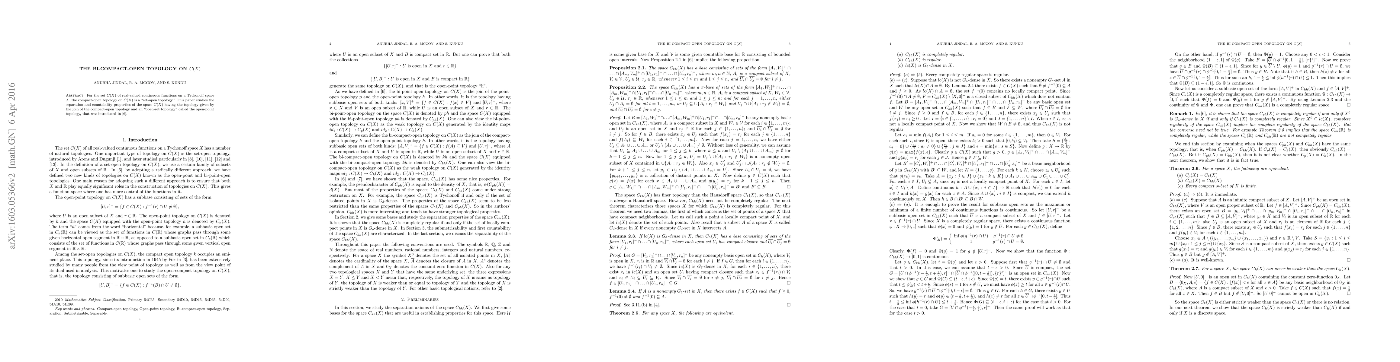 This paper explores the separation and countability properties of the space C(X) of continuous real-valued functions on a Tychonoff space X, equipped with the bi-compact-open topology, which combines the compact-open topology with an open-point topology.
