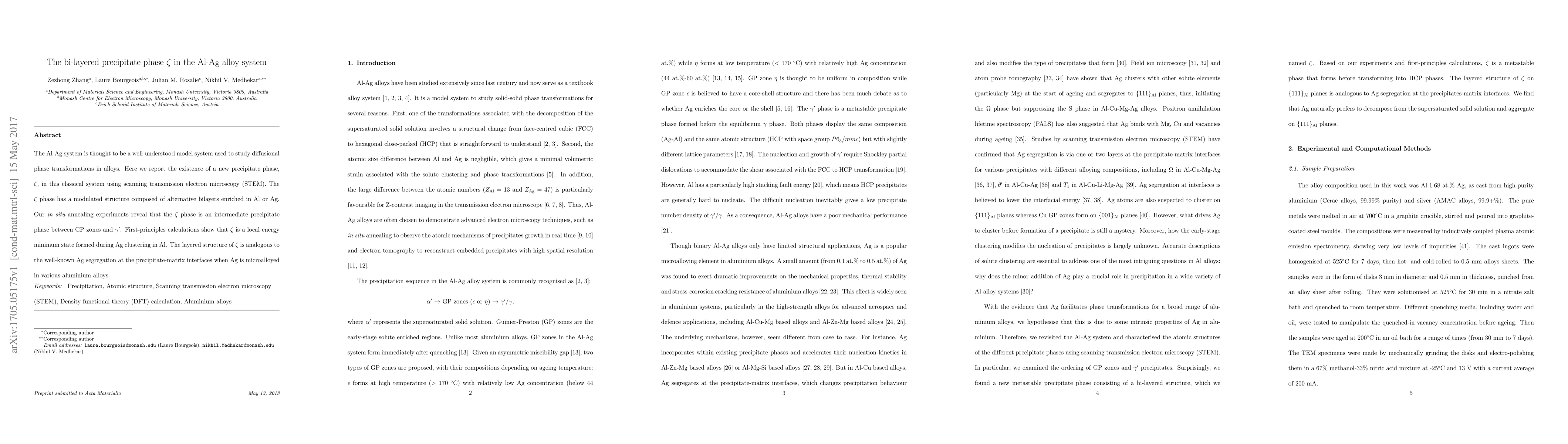This study identifies a new bi-layered precipitate phase, zeta, in the Al-Ag alloy system using STEM, revealing its modulated structure of alternating Al or Ag-rich layers. In situ annealing experiments show zeta as an intermediate phase between GP zones epsilon and gamma prime, with first-principles calculations confirming it as a local energy minimum state during Ag clustering in Al.