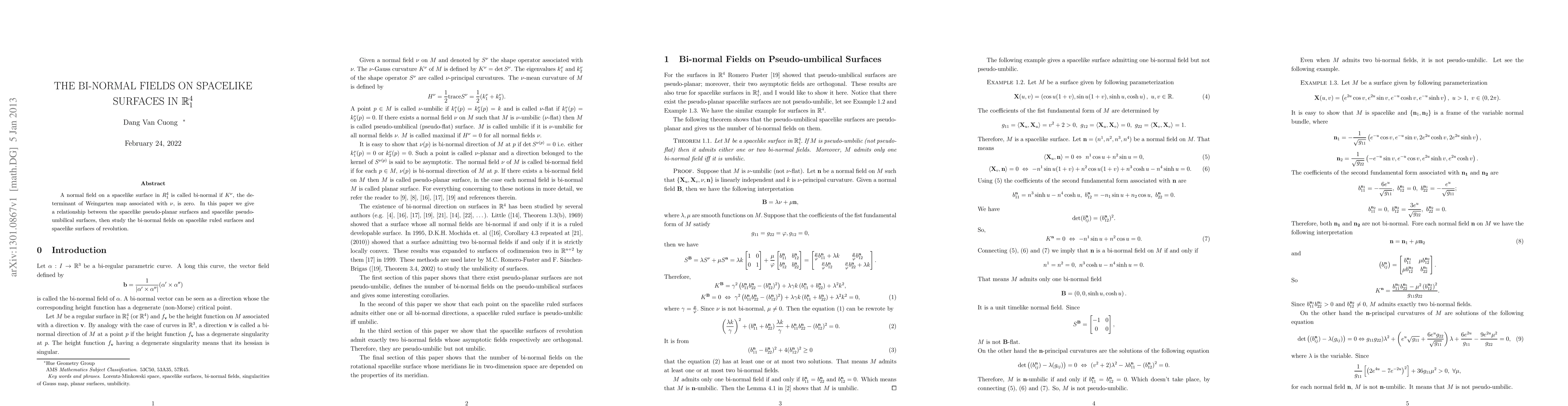 This paper explores bi-normal fields on spacelike surfaces in $R^4_1$, where $K^{\nu}$ is zero. It establishes a connection between spacelike pseudo-planar and pseudo-umbilical surfaces, and investigates bi-normal fields in spacelike ruled surfaces and surfaces of revolution.