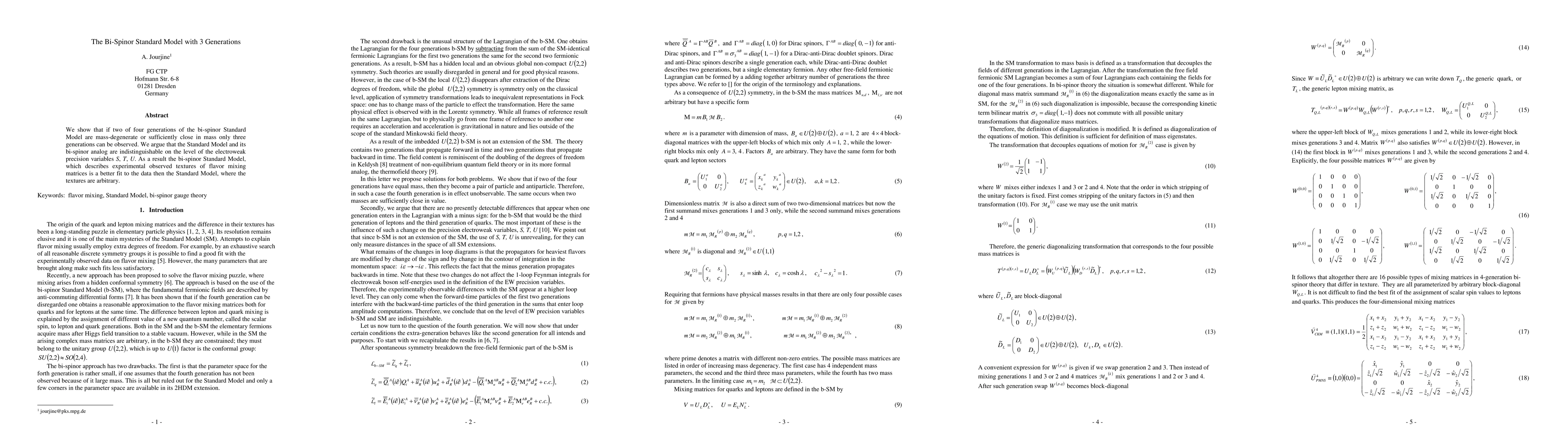 We show that if two of four generations of the bi-spinor Standard Model are mass-degenerate or sufficiently close in mass only three generations can be observed. We argue that the Standard Model and its bi-spinor analog are indistinguishable on the level of the electroweak precision variables S, T, U. As a result the bi-spinor Standard Model, which describes experimental observed textures of flavor mixing matrices is a better fit to the data then the Standard Model, where the textures are arbitrary.