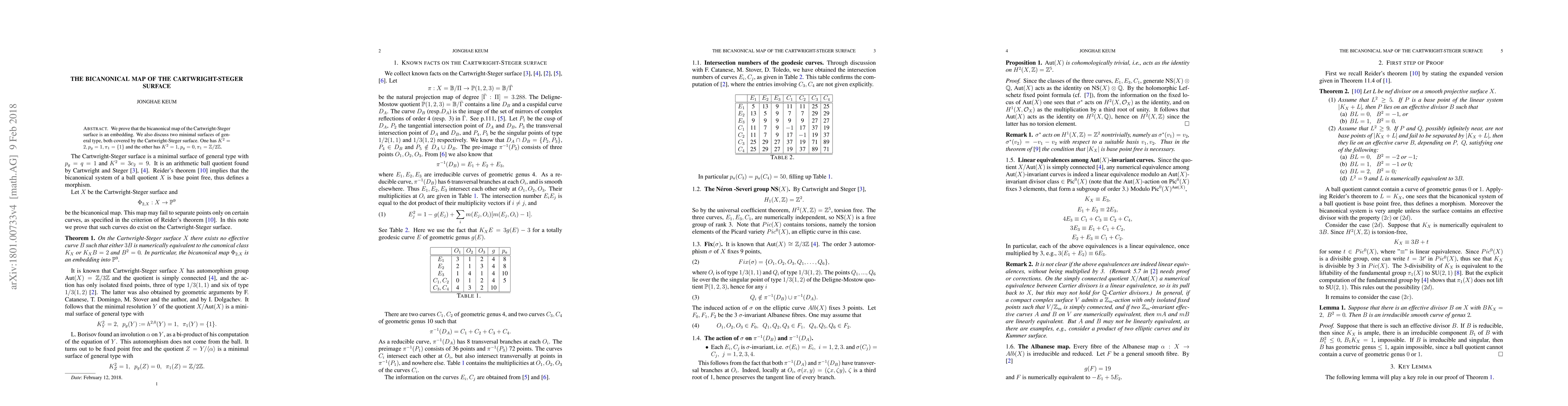 We prove that the bicanonical map of the Cartwright-Steger surface is an embedding. We also discuss two minimal surfaces of general type, both covered by the Cartwright-Steger surface. One has $K^2=2$, $p_g=1$, $\pi_1=\{1\}$ and the other has $K^2=1$, $p_g=0$, $\pi_1=\mathbb{Z}/2\mathbb{Z}$.