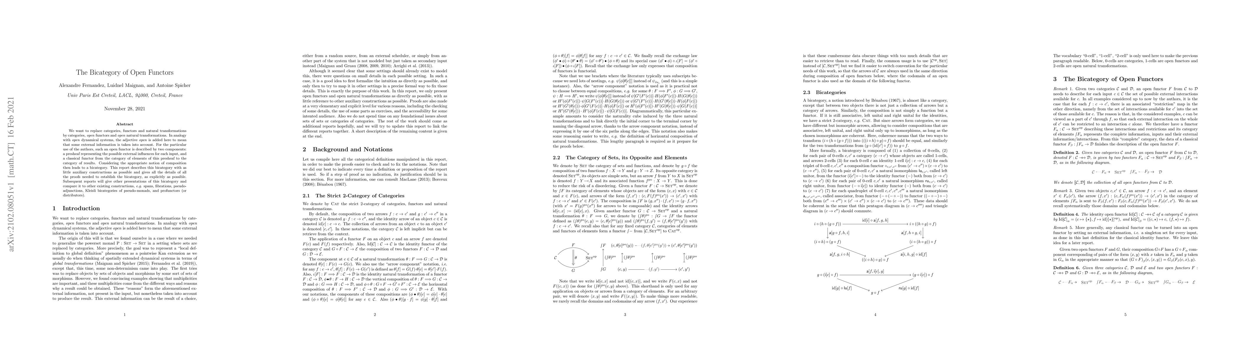 We want to replace categories, functors and natural transformations by categories, open functors and open natural transformations. In analogy with open dynamical systems, the adjective open is added here to mean that some external information is taken into account. For the particular use of the authors, such an open functor is described by two components: a presheaf representing the possible external influences for each input, and a classical functor from the category of elements of this presheaf to the category of results. Considering the appropriate notion of composition then leads to a bicategory. This report describes this bicategory with as little auxiliary constructions as possible and gives all the details of all the proofs needed to establish the bicategory, as explicitly as possible. Subsequent reports will give other presentations of this bicategory and compare it to other existing constructions, e.g. spans, fibrations, pseudoadjunctions, Kleisli bicategories of pseudo-monads, and profunctors (or distributors).