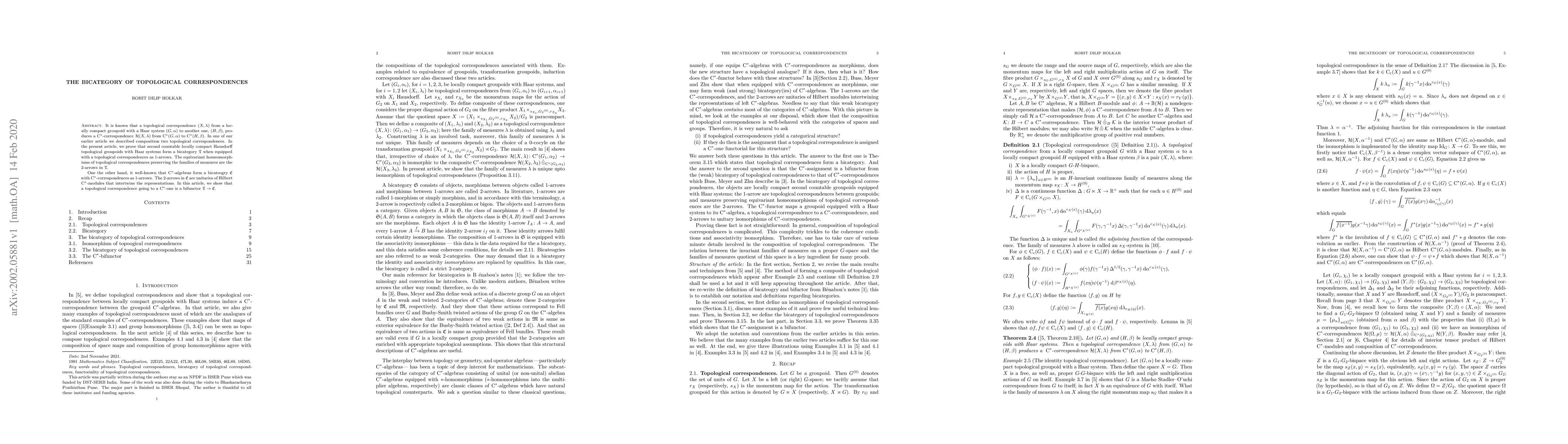 This paper demonstrates that second countable locally compact Hausdorff topological groupoids with Haar systems, equipped with topological correspondences, form a bicategory \(\mathfrak{T}\). It also establishes a bifunctor from \(\mathfrak{T}\) to the bicategory \(\mathfrak{C}\) of \(\textrm{C}^*\)-algebras and \(\textrm{C}^*\)-correspondences, showing how topological correspondences correspond to \(\textrm{C}^*\)-correspondences.