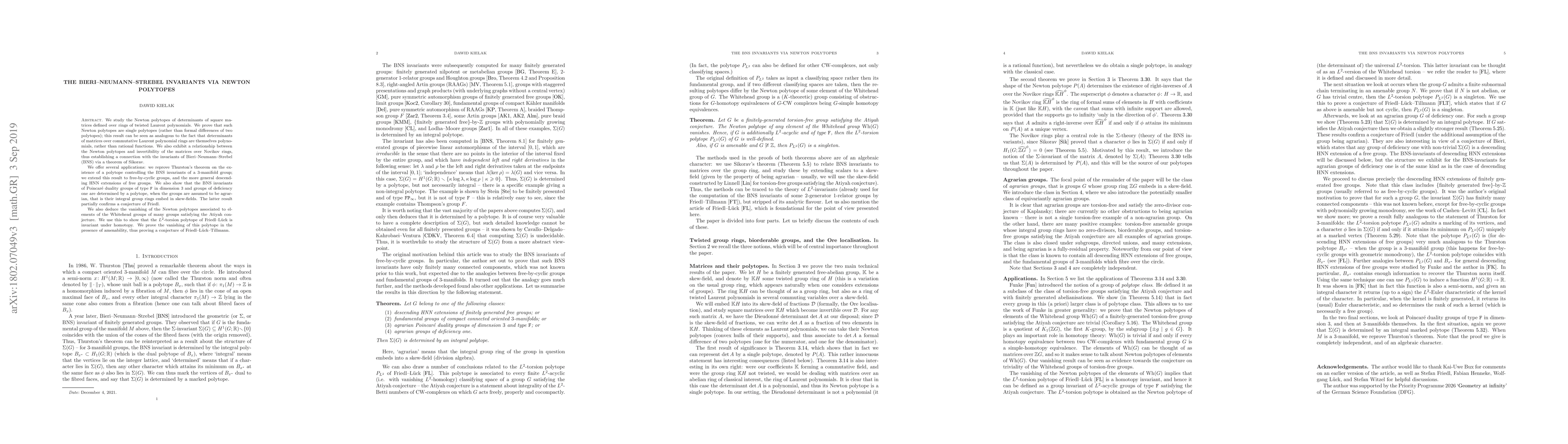We study the Newton polytopes of determinants of square matrices defined over rings of twisted Laurent polynomials. We prove that such Newton polytopes are single polytopes (rather than formal differences of two polytopes); this result can be seen as analogous to the fact that determinants of matrices over commutative Laurent polynomial rings are themselves polynomials, rather than rational functions. We also exhibit a relationship between the Newton polytopes and invertibility of the matrices over Novikov rings, thus establishing a connection with the invariants of Bieri-Neumann-Strebel (BNS) via a theorem of Sikorav. We offer several applications: we reprove Thurston's theorem on the existence of a polytope controlling the BNS invariants of a $3$-manifold group; we extend this result to free-by-cyclic groups, and the more general descending HNN extensions of free groups. We also show that the BNS invariants of Poincar\'e duality groups of type $\mathtt{F}$ in dimension $3$ and groups of deficiency one are determined by a polytope, when the groups are assumed to be agrarian, that is their integral group rings embed in skew-fields. The latter result partially confirms a conjecture of Friedl. We also deduce the vanishing of the Newton polytopes associated to elements of the Whitehead groups of many groups satisfying the Atiyah conjecture. We use this to show that the $L^2$-torsion polytope of Friedl-L\"uck is invariant under homotopy. We prove the vanishing of this polytope in the presence of amenability, thus proving a conjecture of Friedl-L\"uck-Tillmann.