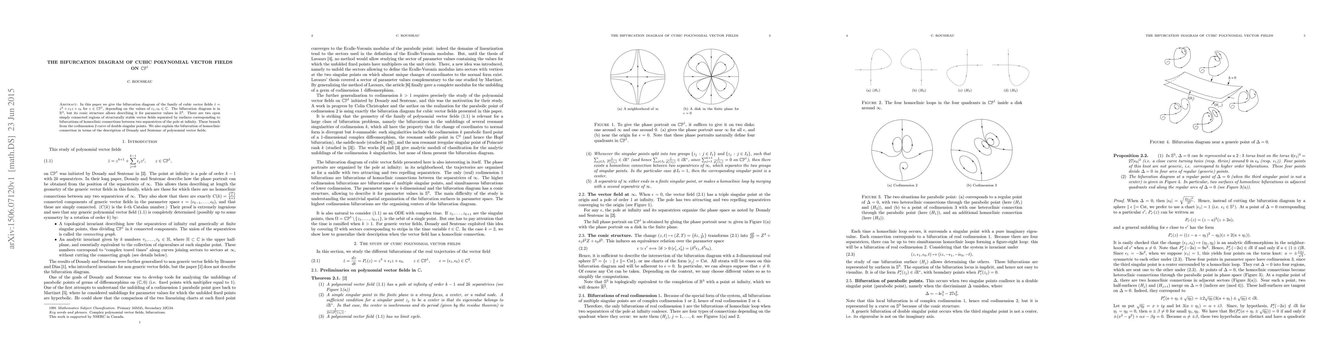 In this paper we give the bifurcation diagram of the family of cubic vector fields $\dot z=z^3+ \epsilon_1z+\epsilon_0$ for $z\in \mathbb{C}\mathbb{P}^1$, depending on the values of $\epsilon_1,\epsilon_0\in\mathbb{C}$. The bifurcation diagram is in $\mathbb{R}^4$, but its conic structure allows describing it for parameter values in $\mathbb{S}^3$. There are two open simply connected regions of structurally stable vector fields separated by surfaces corresponding to bifurcations of homoclinic connections between two separatrices of the pole at infinity. These branch from the codimension 2 curve of double singular points. We also explain the bifurcation of homoclinic connection in terms of the description of Douady and Sentenac of polynomial vector fields.