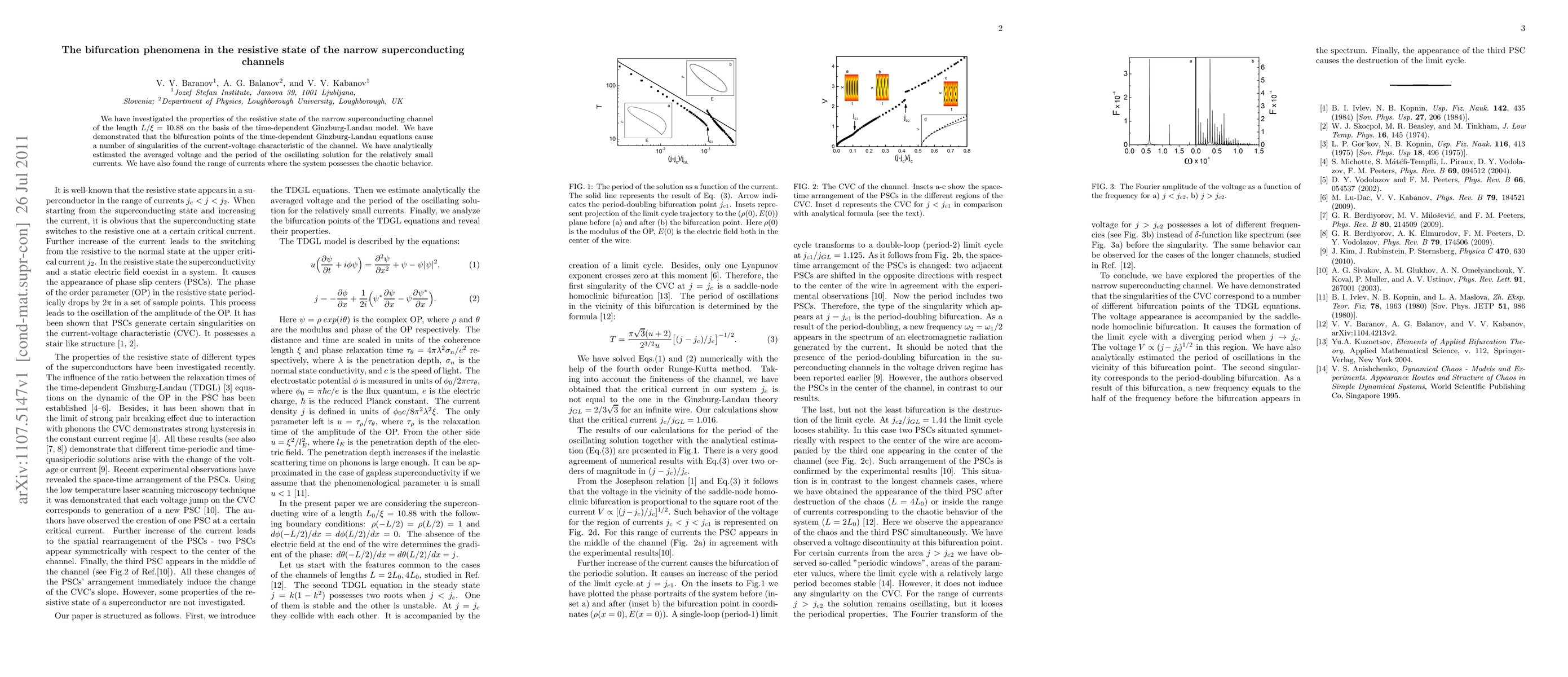 This paper investigates the resistive state of narrow superconducting channels using the time-dependent Ginzburg-Landau model, revealing bifurcation points that lead to current-voltage characteristic singularities. The study analytically estimates the averaged voltage and chaotic behavior range for small currents.