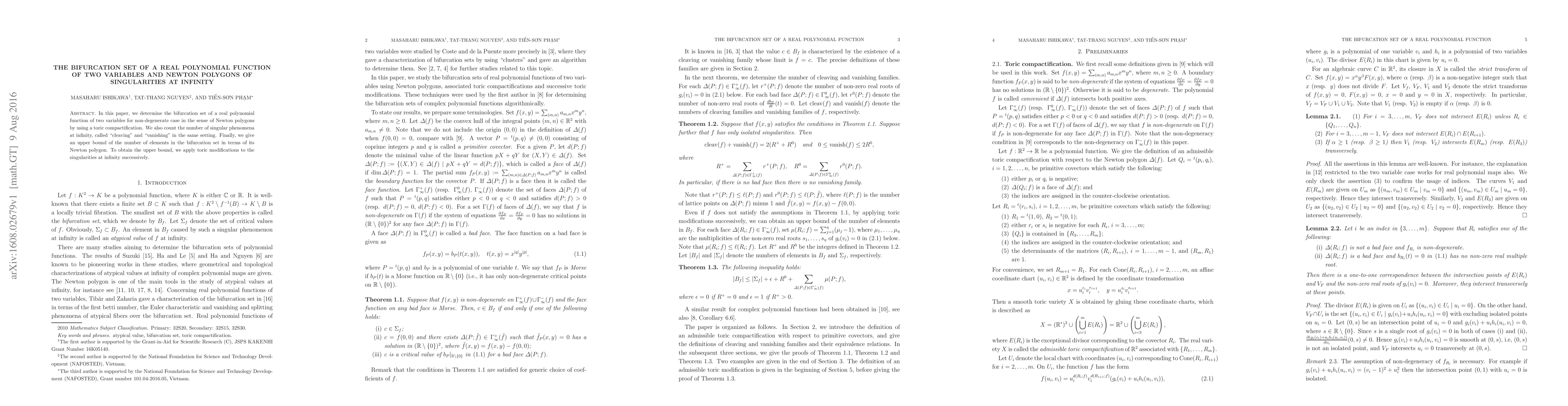 This paper determines the bifurcation set of a real polynomial function of two variables using toric compactification, counts singular phenomena at infinity, and provides an upper bound for the number of elements in the bifurcation set based on its Newton polygon through successive toric modifications.