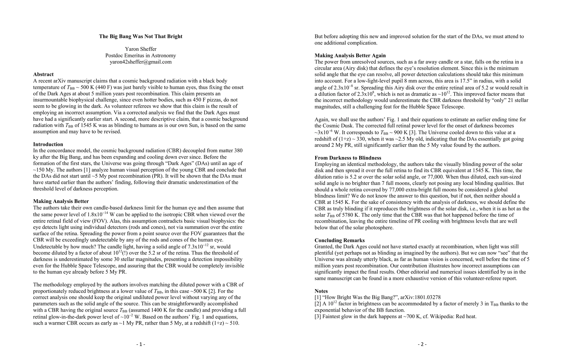A recent arXiv manuscript, arXiv:1801.03278, claims that a cosmic background radiation with a black body temperature of $T_{\rm BB}$ ~ 500 K (440 F) was just barely visible to human eyes, thus fixing the onset of the Dark Ages at about 5 million years post recombination. This claim presents an insurmountable biophysical challenge, since even hotter bodies, such as 450 F pizzas, do not seem to be glowing in the dark. As volunteer referees we show that this claim is the result of employing an incorrect assumption. Via a corrected analysis we find that the Dark Ages must have had a significantly earlier start. A second, more descriptive claim, that a cosmic background radiation with $T_{\rm BB}$ of 1545 K was as blinding to humans as is our own Sun, is based on the same assumption and may have to be revised.